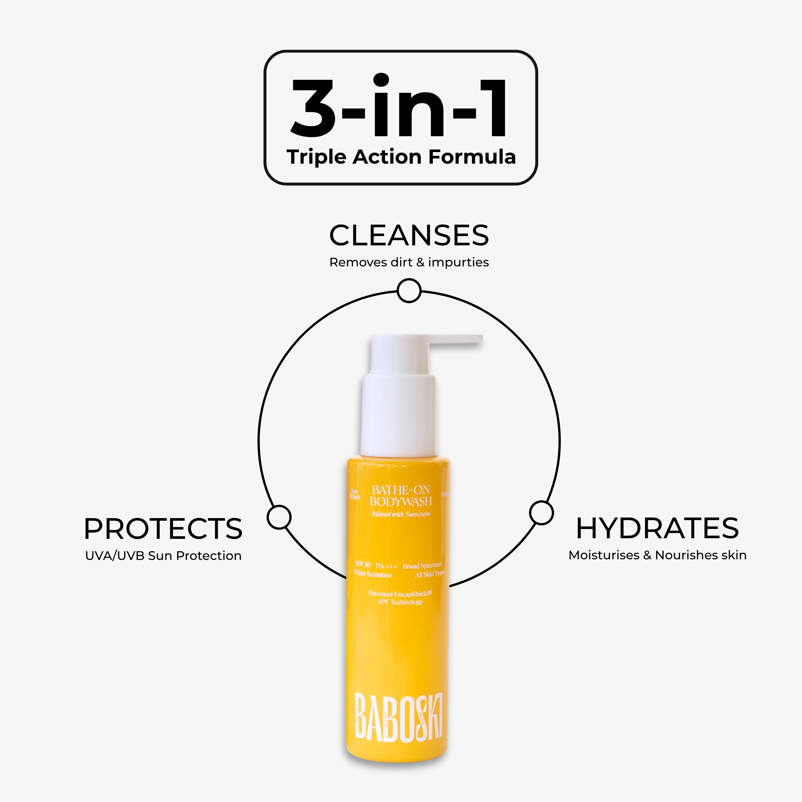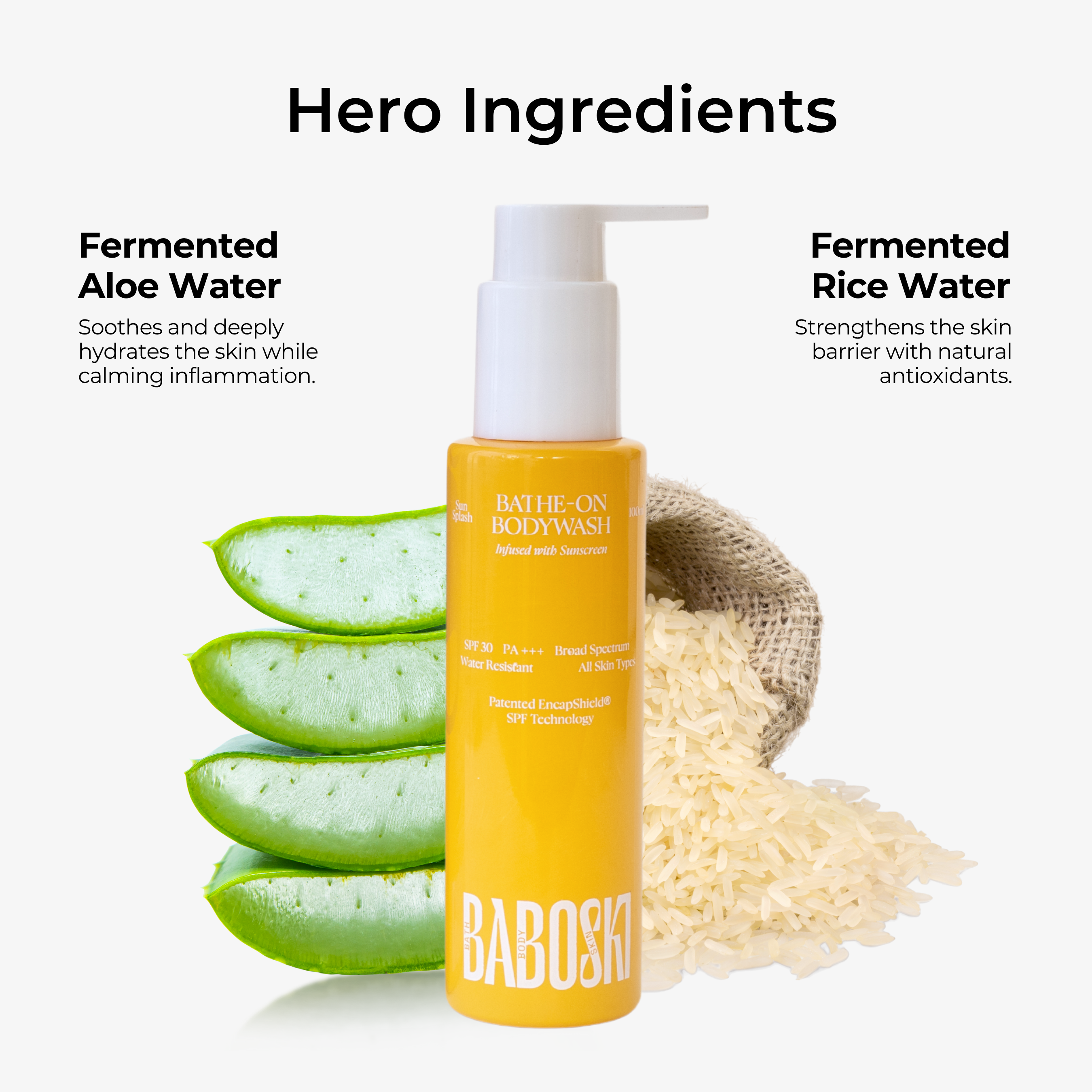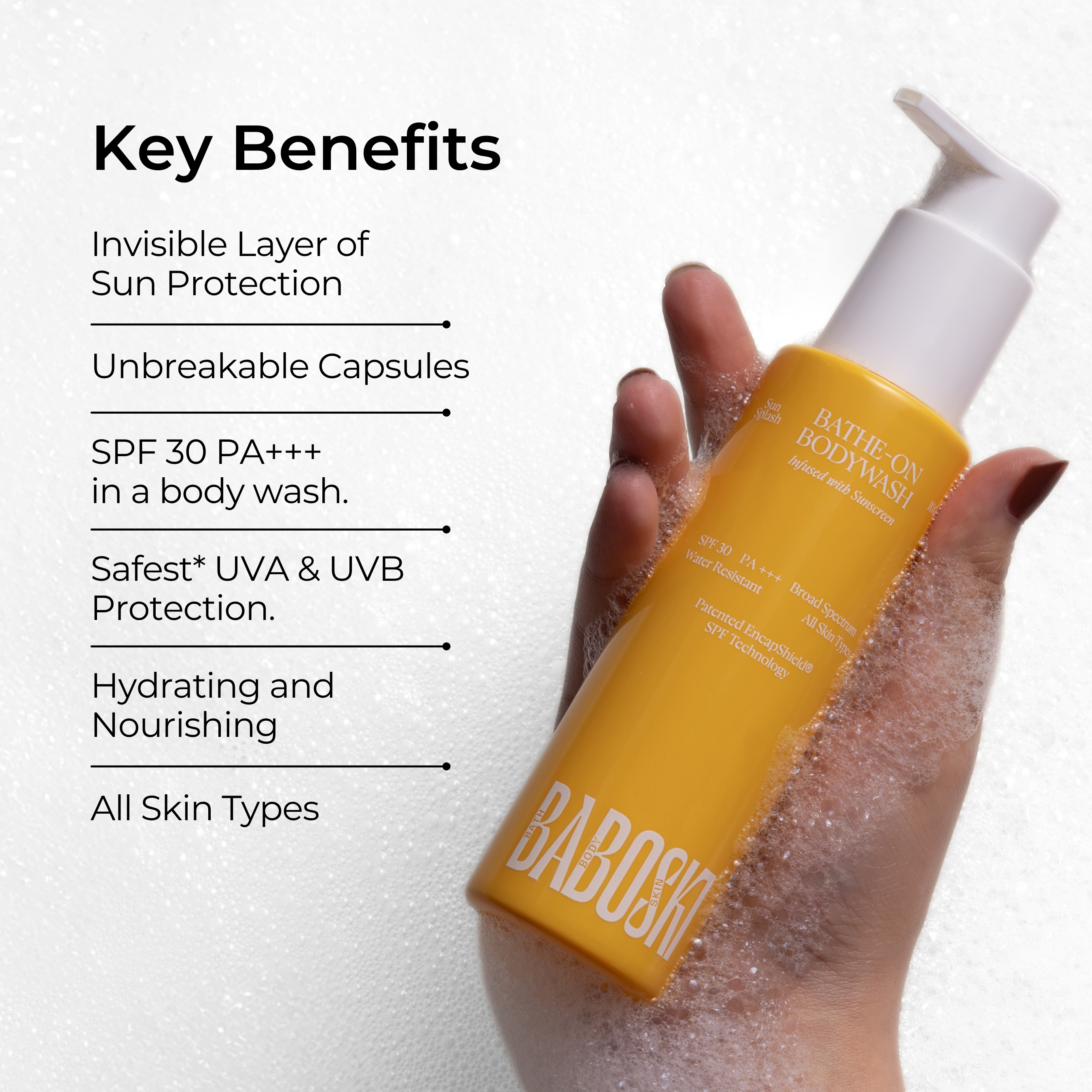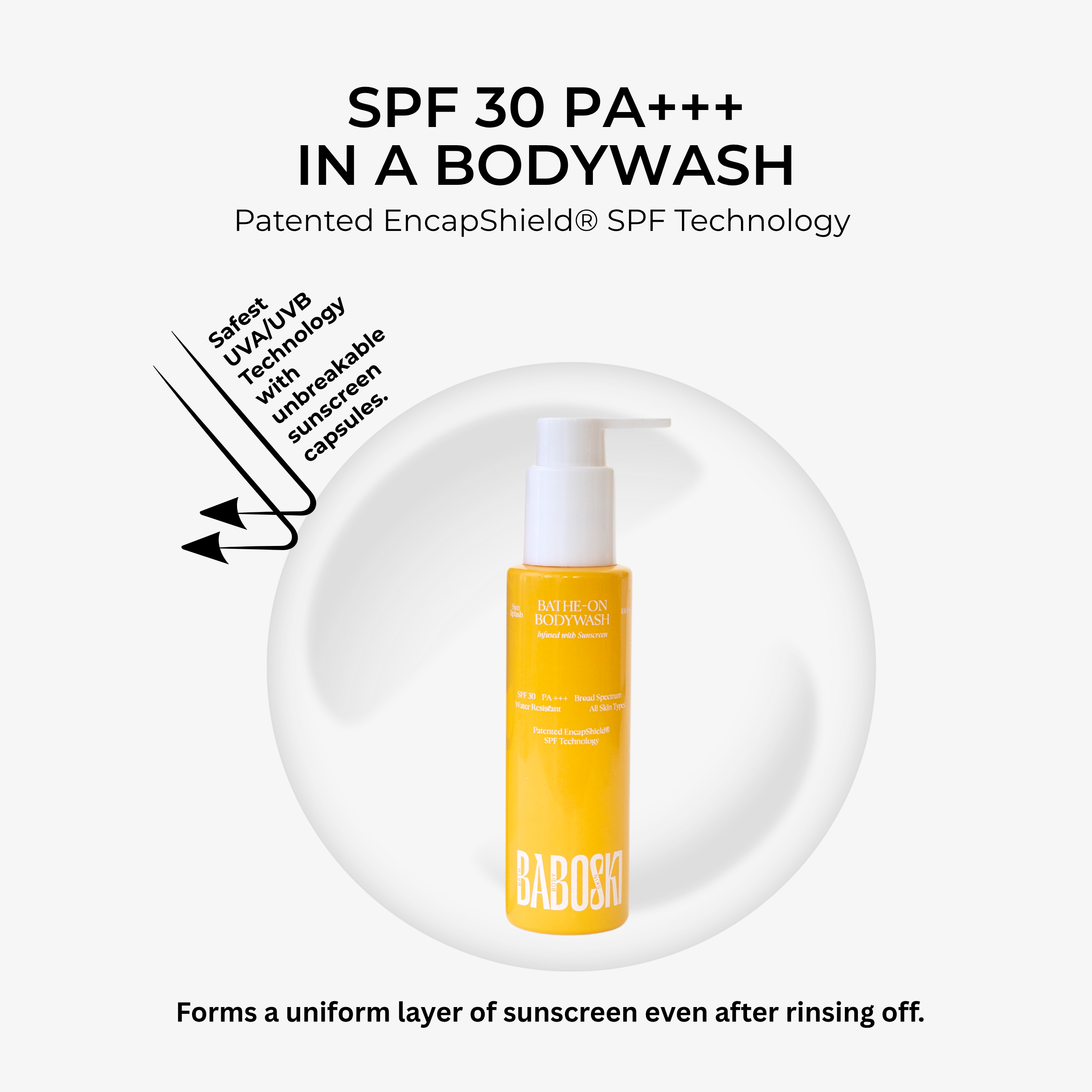 Baboski Sun Splash Bathe-On Indias 1st SPF 30 PA+++ Bathe-On Sunscreen Body Wash with Patented EncapShield Technology Upgrade your sun protection routine with Baboski Sun Splash Bathe-On, Indias first sunscreen body wash with SPF 30 PA+++ powered by patented EncapShield SPF Technology. This revolutionary formula cleanses, hydrates, and protect your skin from harmful UVA & UVB rays in just one step. Enriched with fermented rice water, known for its skin-brightening and soothing benefits, and fermented aloe vera, renowned for deep hydration and skin repair, this body wash removes dirt while leaving your skin nourished, protected, and refreshed.