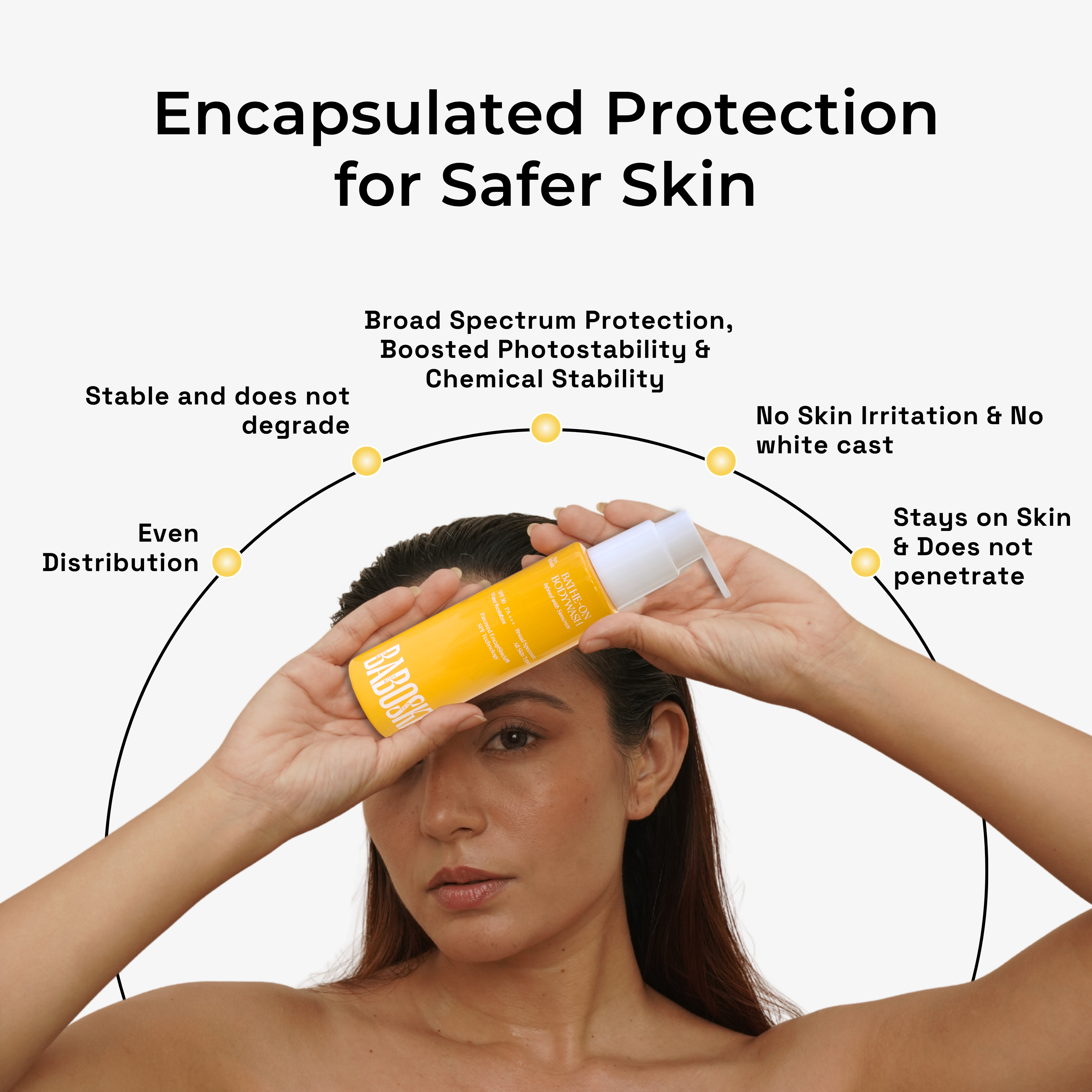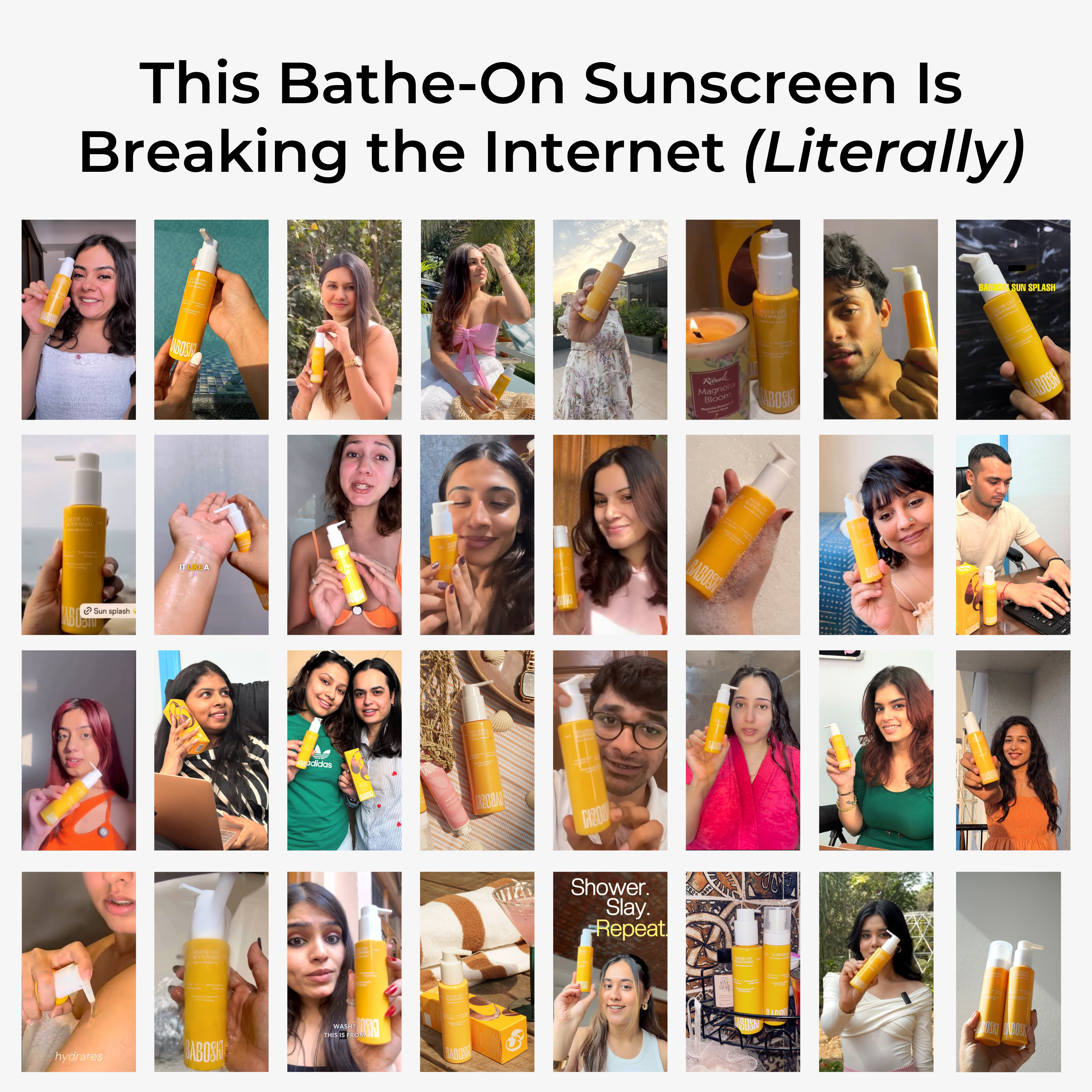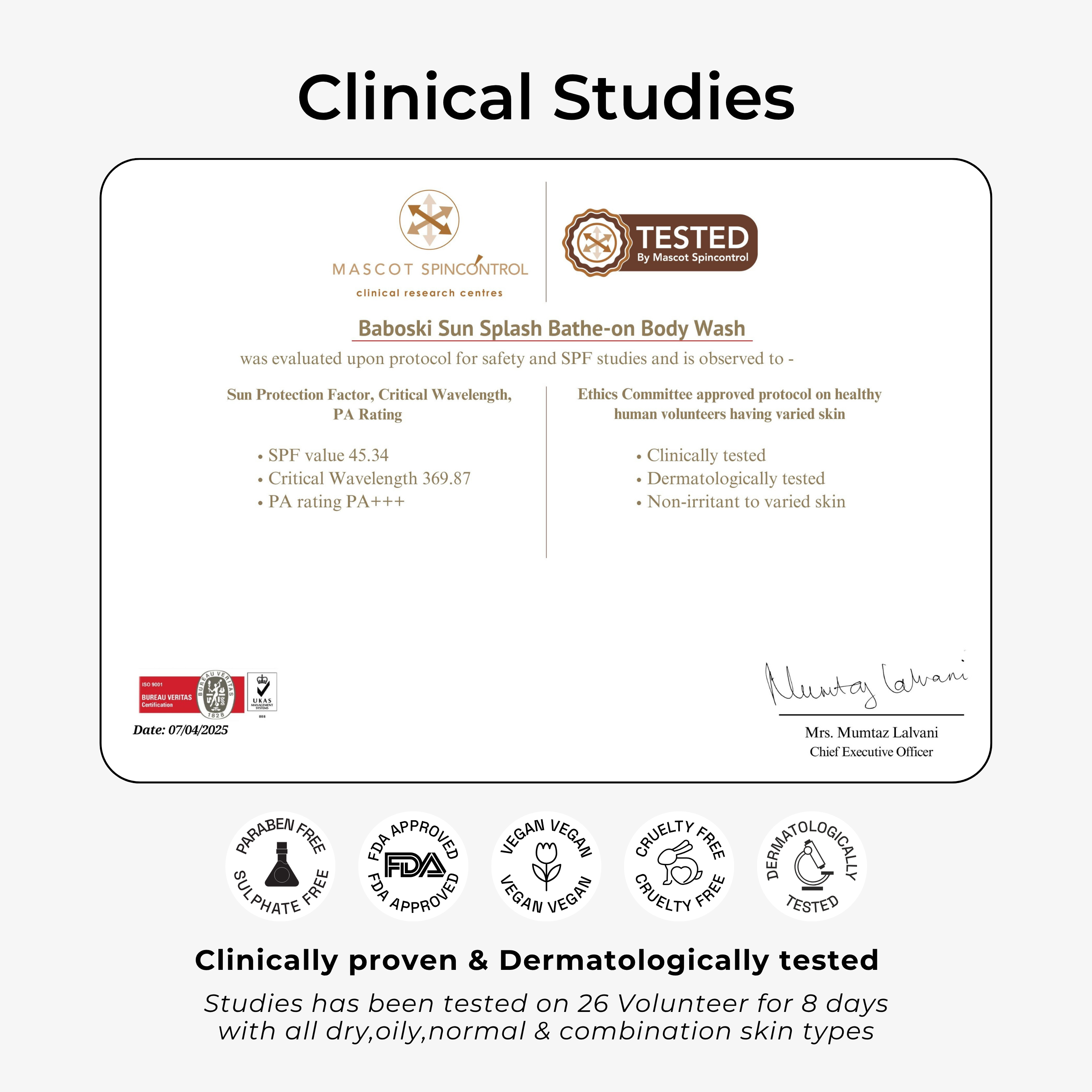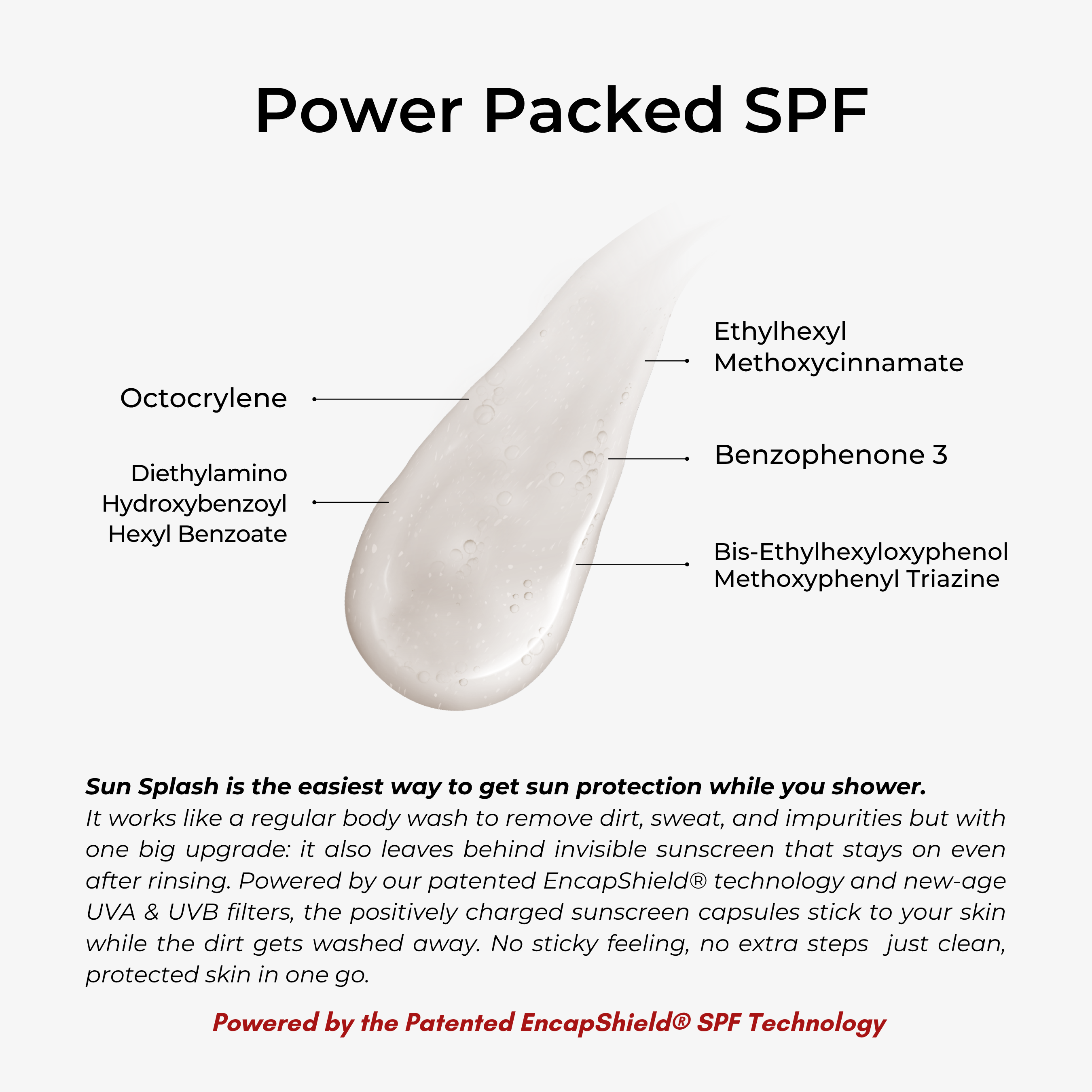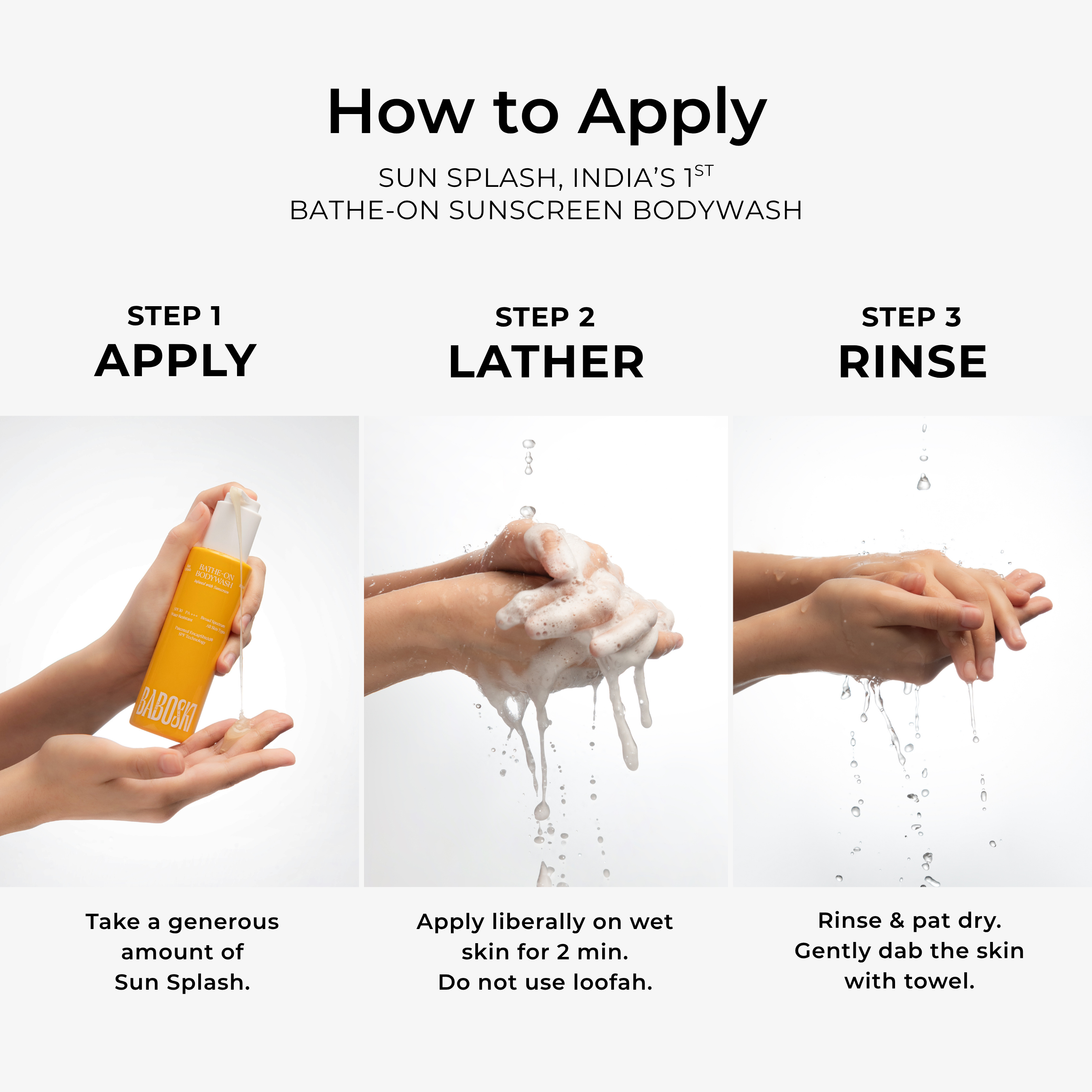 Baboski Sun Splash Bathe-On Indias 1st SPF 30 PA+++ Bathe-On Sunscreen Body Wash with Patented EncapShield Technology Upgrade your sun protection routine with Baboski Sun Splash Bathe-On, Indias first sunscreen body wash with SPF 30 PA+++ powered by patented EncapShield SPF Technology. This revolutionary formula cleanses, hydrates, and protect your skin from harmful UVA & UVB rays in just one step. Enriched with fermented rice water, known for its skin-brightening and soothing benefits, and fermented aloe vera, renowned for deep hydration and skin repair, this body wash removes dirt while leaving your skin nourished, protected, and refreshed.