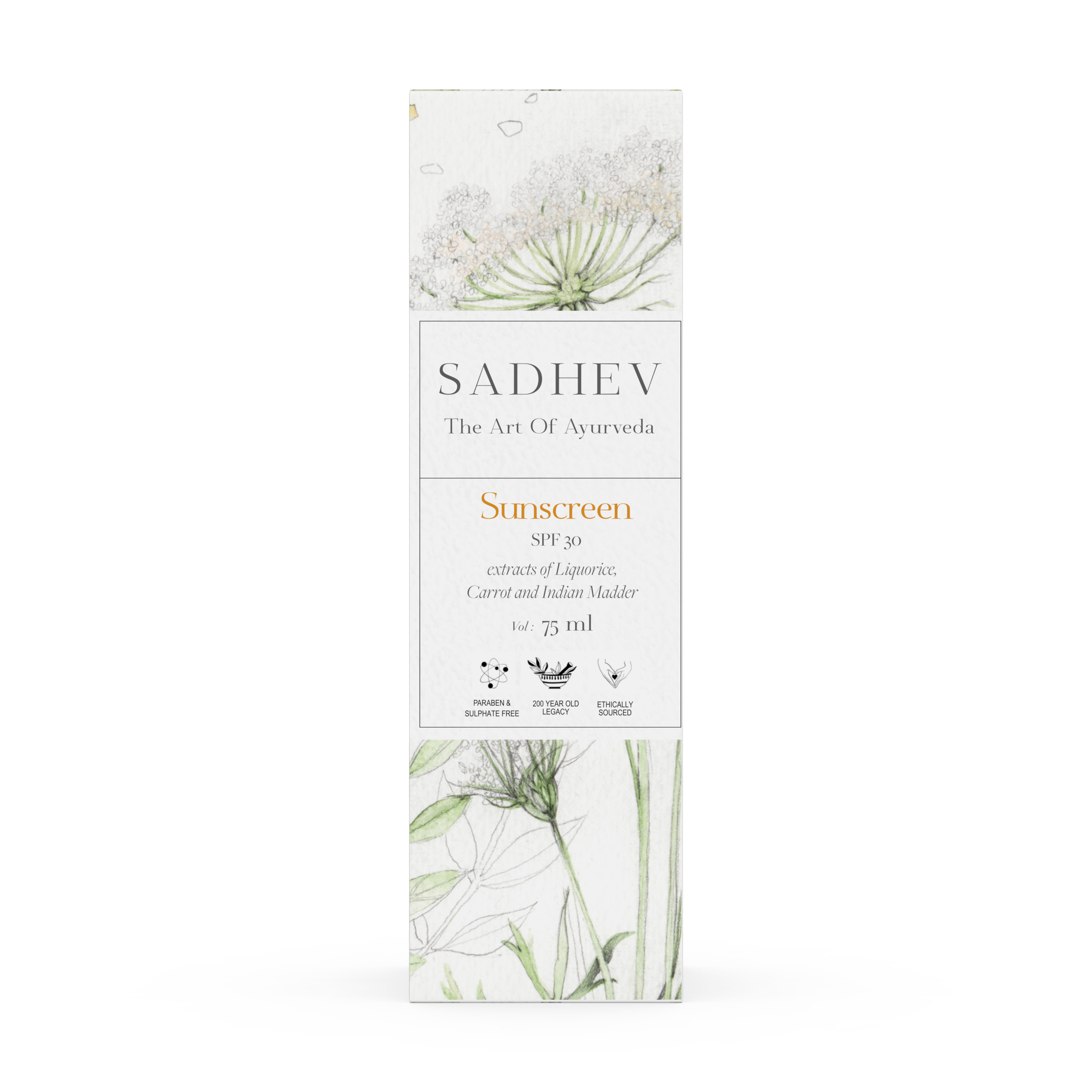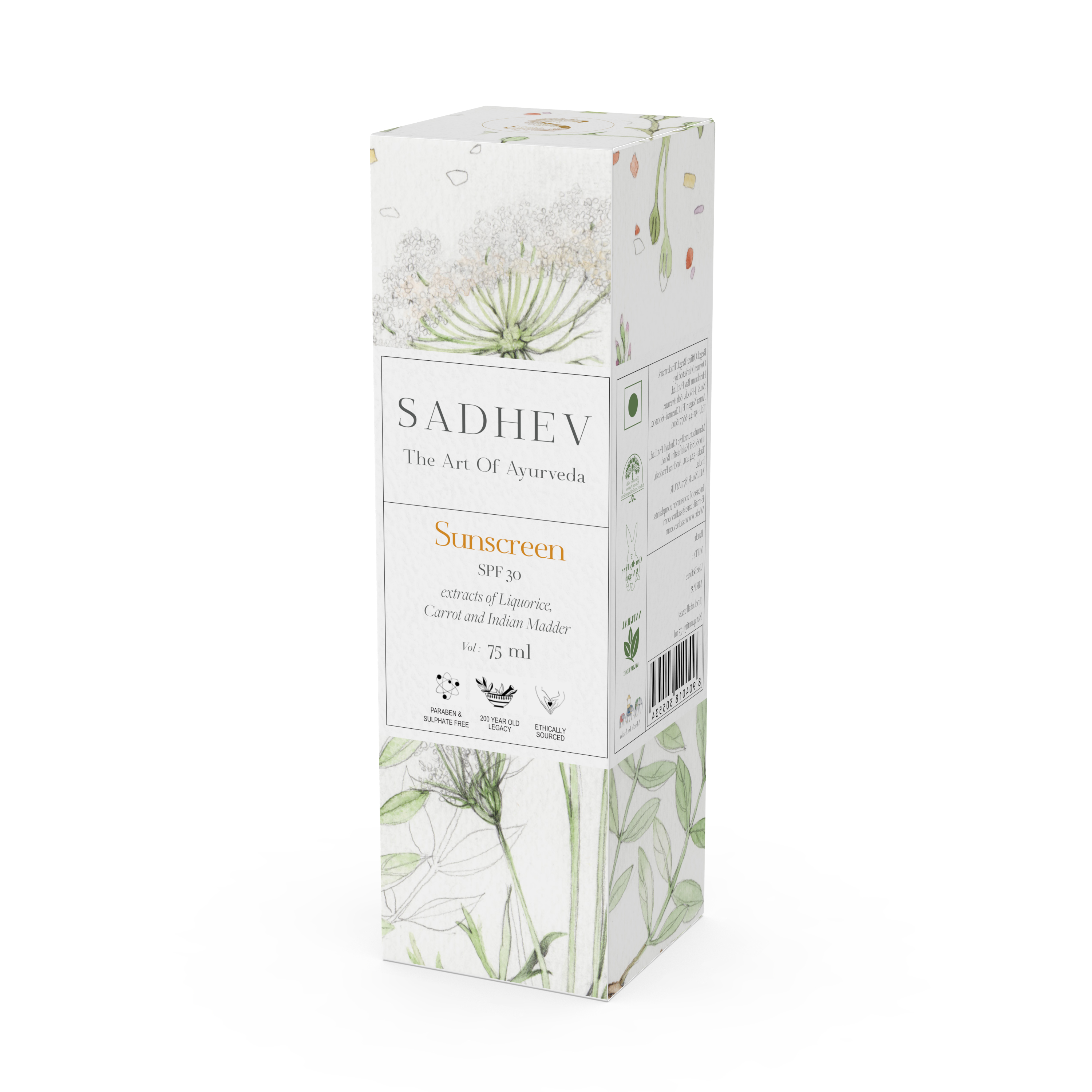 Sadhevs Sunscreen is for individuals who are looking for an Ayurvedic solution to the harsh UV rays of the sun. It also helps recover elastin fibre in the skin leaving it looking young and blemish free and creating a complexion that is exquisitely radiant and gloriously spotless. It has a SPF content of 30 and is light in texture making it easy for everyday application. Suitable for all skin types.