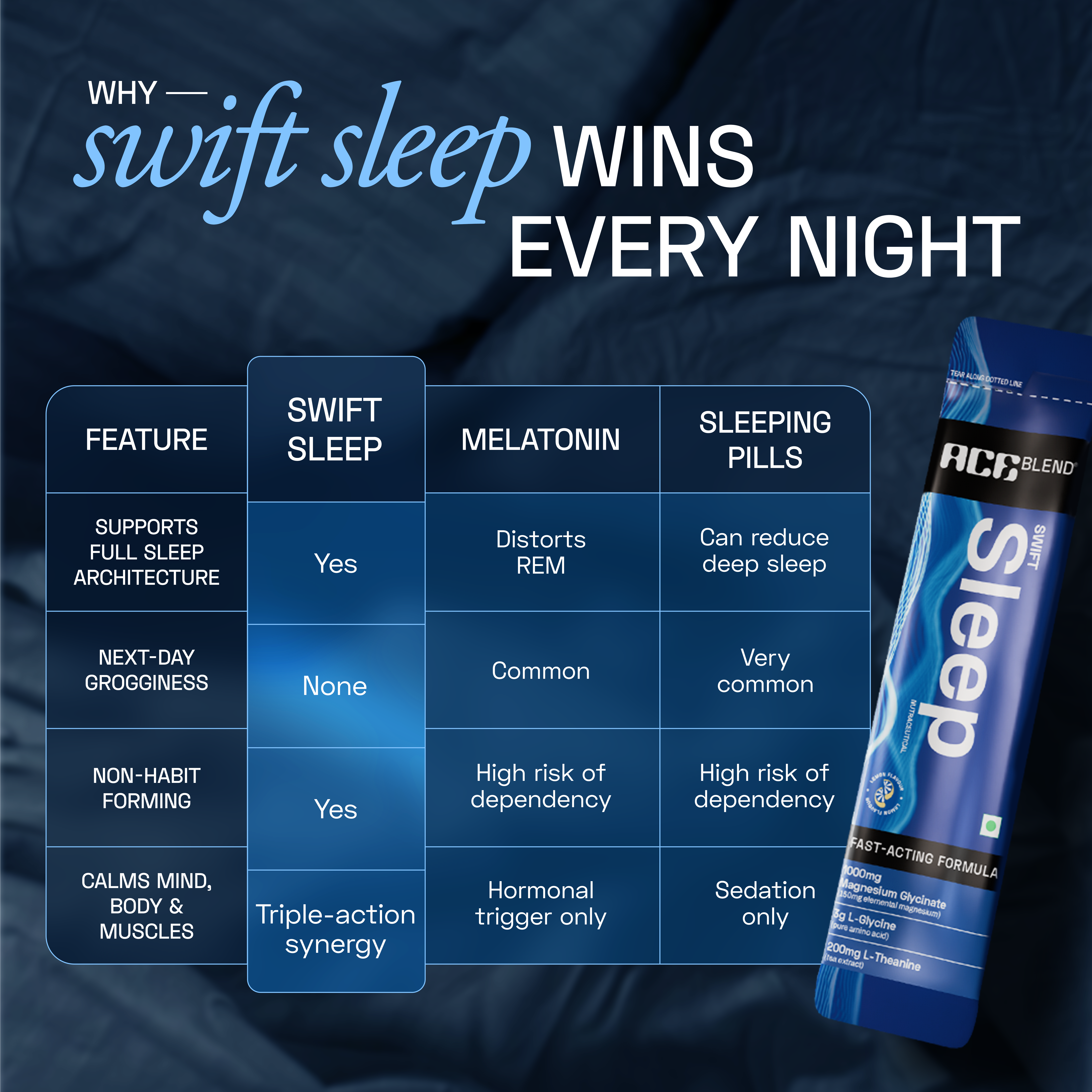 Ace Blend Swift Sleep is a thoughtfully crafted nighttime formula designed to support relaxation, deep sleep, and overnight recovery. Powered by magnesium glycinate, L-theanine, and glycine, this advanced blend helps calm the mind, relax the body, and prepare you for restful, uninterrupted sleep.