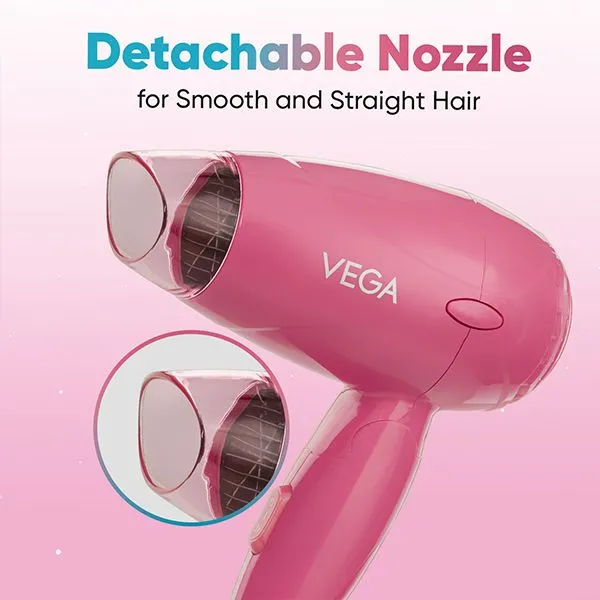 Vega Travel-Pro 1200W Hair Dryer is here to get your hair styling going right with an extra edge of comfort. Featuring a Compact Design and Foldable Handle that makes it travel-friendly, this hair dryer for women takes your comfortable styling quotient a level up. Its 2 Heat/Speed Settings and Removable Concentrator Nozzle ensures convenient and precise hair dryeing experience, while the Hanging Loop assures you of safe keeping the hair dryer to maintain durability. Other features to enjoy when using this pretty-pink hair dryer are Zig Zag Heater and Overheat Protection to acquire the best hair drying and styling experience. Now carry your partner in style wherever you go and flaunt exceptional style effortlessly!