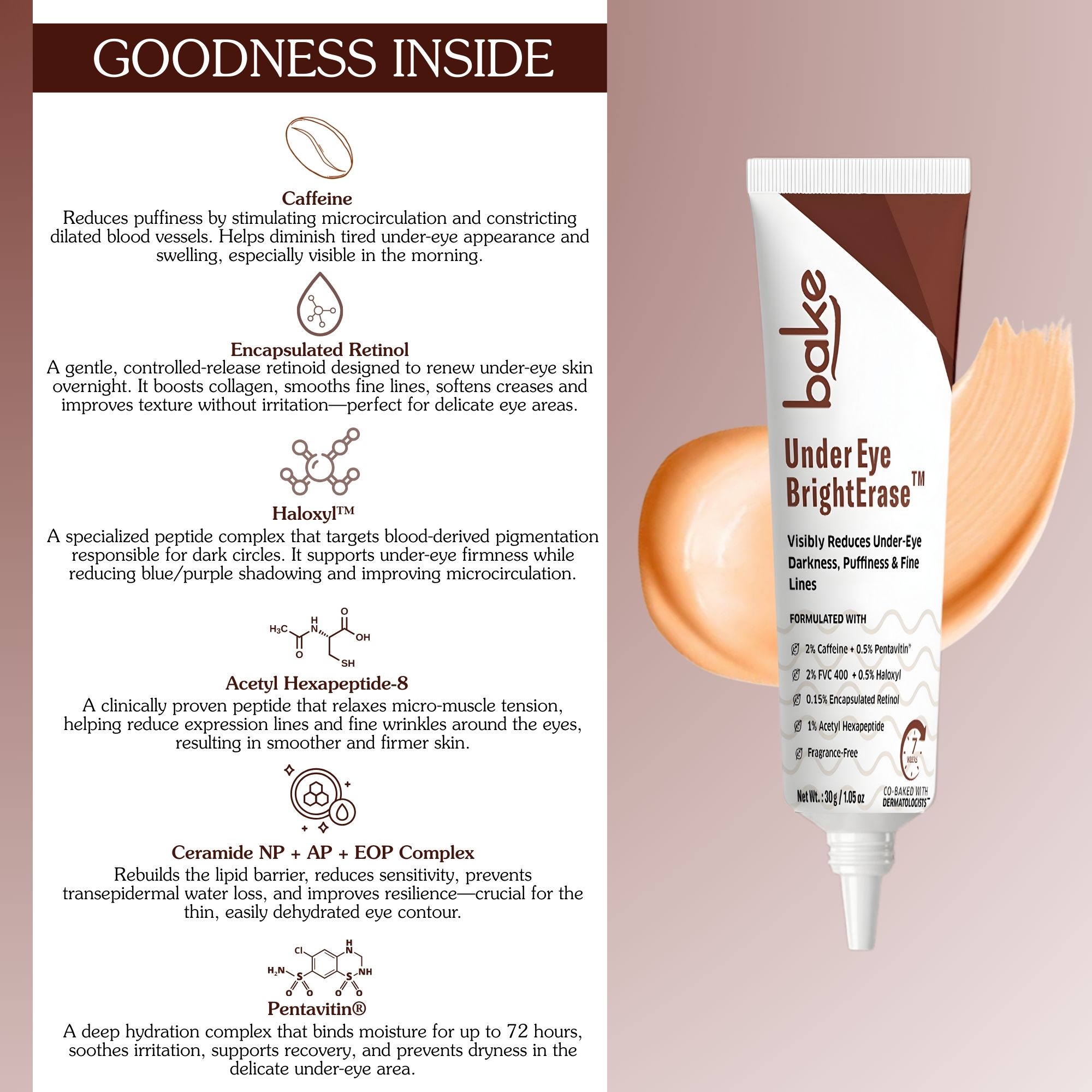 Targets Dark Circles & Pigmentation - Formulated with 2% Caffeine + Vitamin C + Haloxyl, this under eye cream helps visibly reduce dark circles, under eye pigmentation, and tired-looking eyes while improving brightness and overall skin tone. Reduces Puffiness & Eye Bags - Caffeine works to depuff and tighten the under-eye area, helping minimize the appearance of eye bags and morning swelling for a refreshed, well-rested look. Anti-Aging Eye Cream for Fine Lines & Crows Feet - Formulated with 0.15% Encapsulated Retinol + Peptides, this anti aging eye cream supports collagen production, smooths fine lines, and reduces crows feet without harsh irritation. Strengthens & Repairs the Skin Barrier - Infused with Ceramides & Hydrating Actives, it reinforces the delicate under-eye barrier, improves elasticity, and prevents dryness or creasing suitable for daily use. Lightweight, Fast-Absorbing & Suitable for Men & Women - Non-greasy, fragrance-free formula designed for all skin types. Works well under makeup and sunscreen, making it ideal for both men and women.