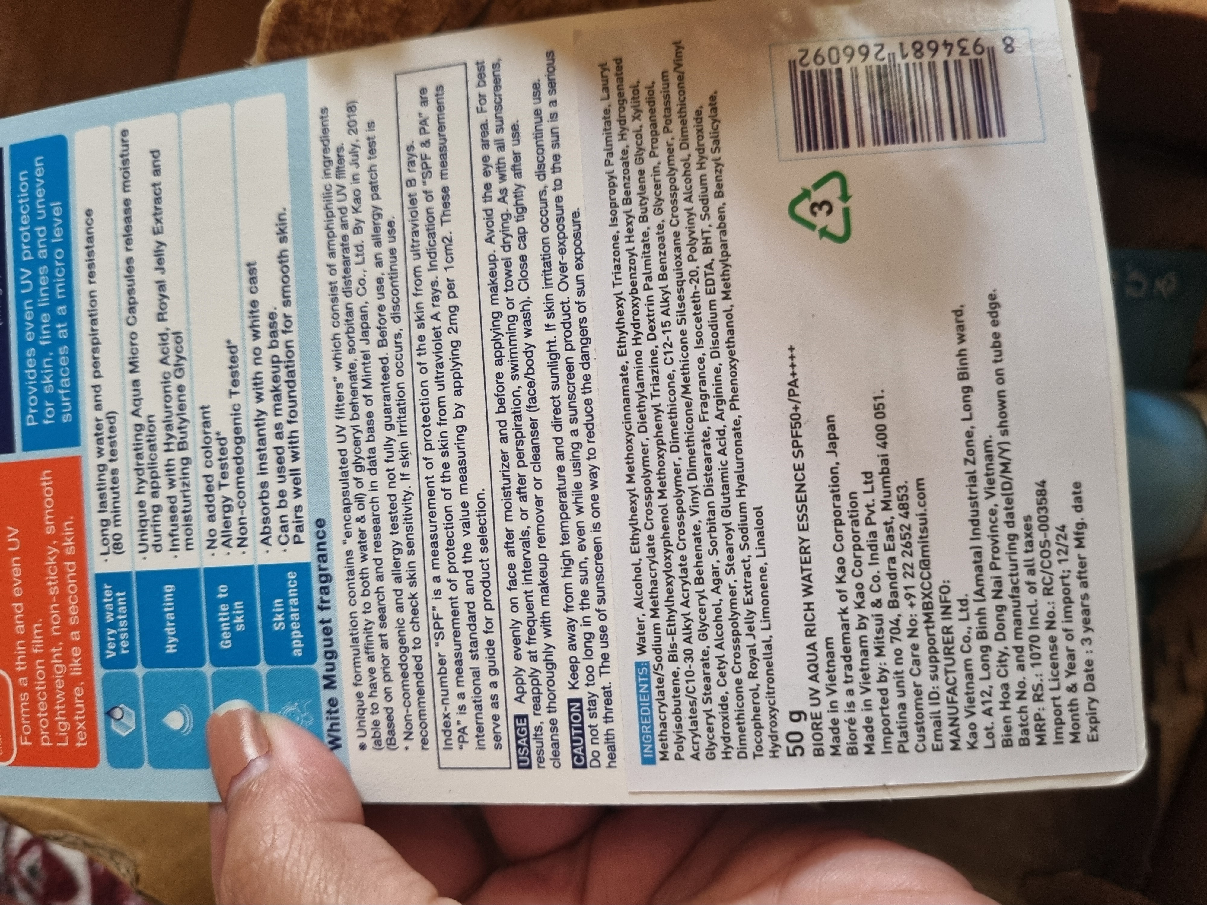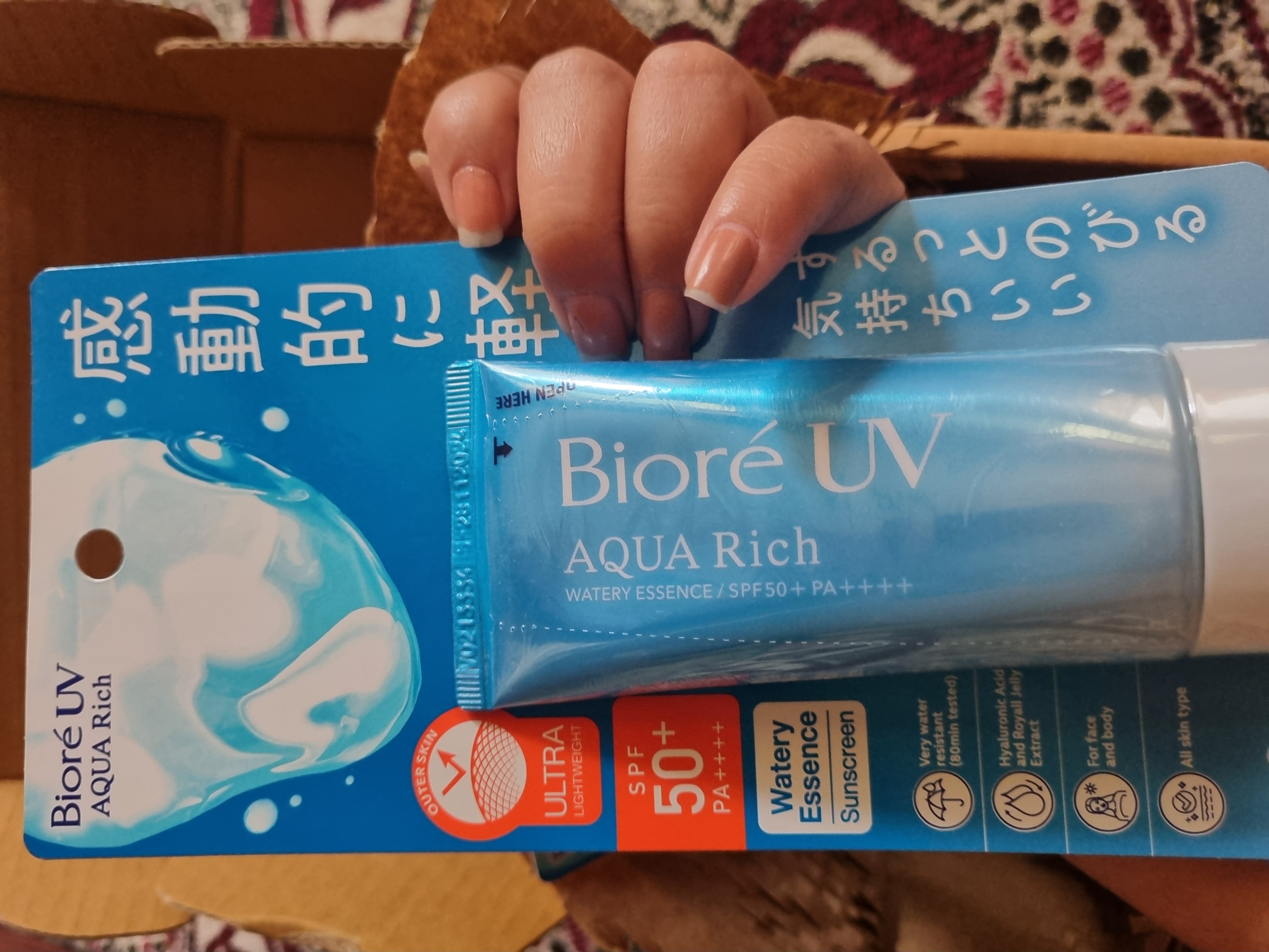 Apply a small amount of UV Aqua Rich Watery Essence Sunscreen SPF 50+ PA++++ (50gm) to your face and neck after moisturizing, massaging gently until absorbed. Reapply every 2 hours during sun exposure. Suitable for all skin types, use daily for UVA/UVB protection. Store in a cool, dry place. Perform a patch test to avoid irritation. Use as the final step in your morning routine.