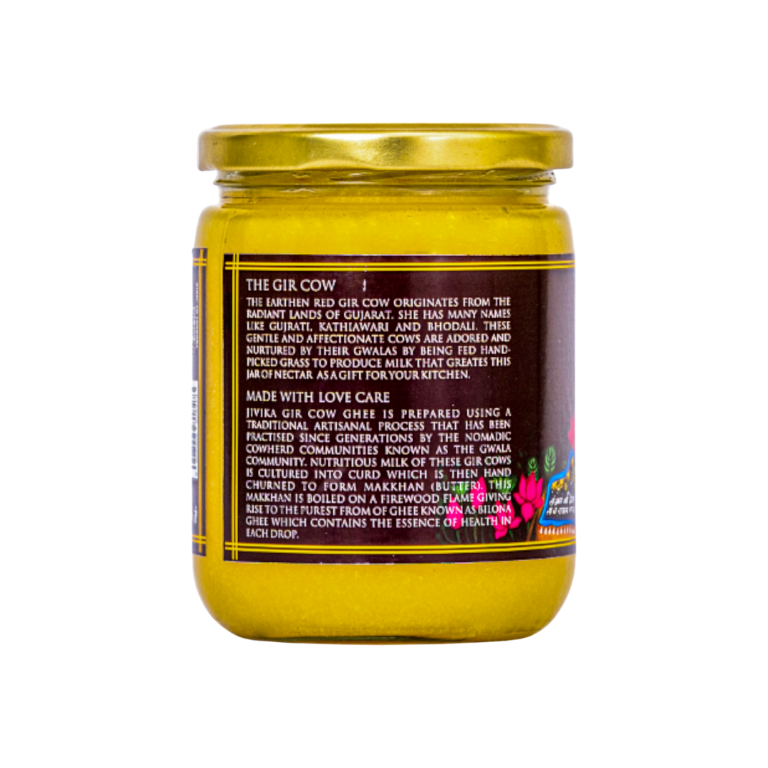 Discover the purity and nutrition of Jivika A2 Gir Cow Ghee, crafted from the milk of single-breed, free-range grass-fed Gir cows. Made only using the traditional Vedic Bilona method, our ghee is hand-churned in small batches from curd, never cream, preserving distinct aroma, flavor, and maximum nutrients.