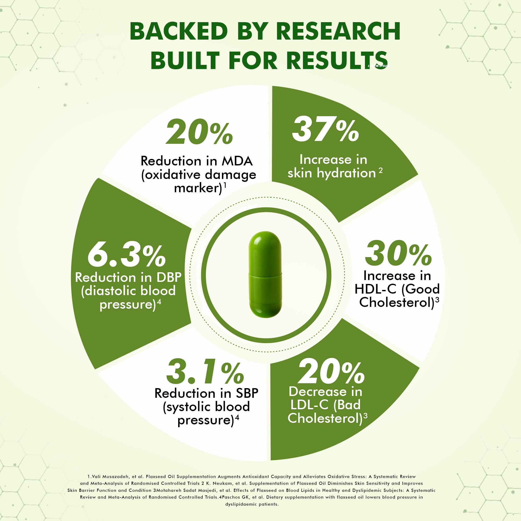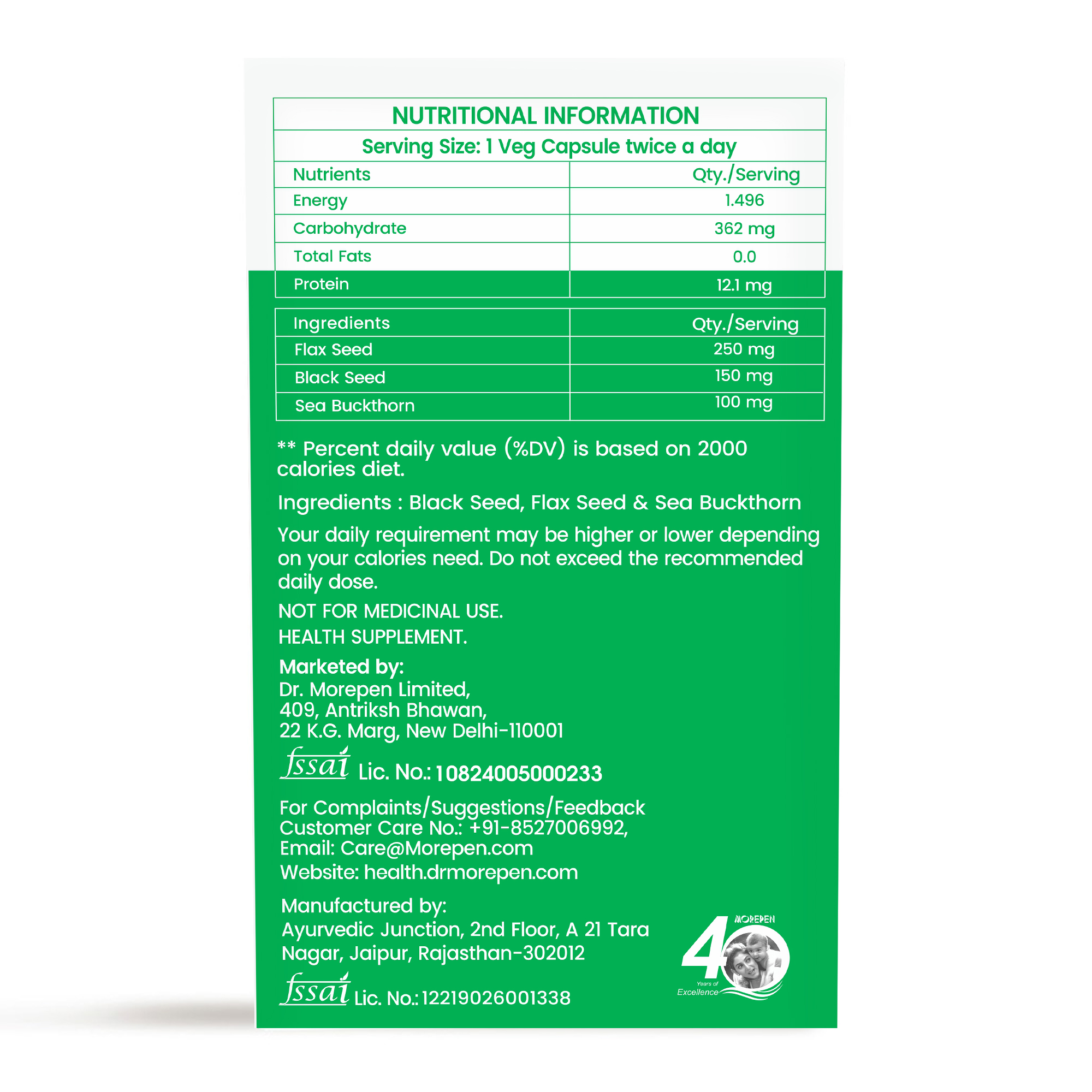 Dr. Morepen brings to you, a 100% vegetarian way to provide you a perfectly balanced Omega-3, 6, 7 & 9 for a healthy heart, sound brain function, metabolism, improved bones and joints health. This unique combination of 4 types of Omegas has been prepared from Omega-3 from Flax Seeds, Omega-7 from Sea Buckthorn and Omega-9 & 6 derived from Black Seeds to create a supplement that is super rich with Omega-3-6-7-9. It is made sustainably and ethically to deliver our bodies pure Omegas directly from the magic of plants. These are safe and natural capsules - free of Additives, Flavours, Heavy Metals or any Preservatives. Story Behind Indian Diet & Omegas Omega-3 and Omega-6 are two major fatty acids that promotes overall well-being of human body, if taken in a balanced proportion. Omega-6 rich diets promote inflammation whereas Omega-3 diets are anti-inflammatory. Most Indian diets have a higher amount of Omega-6 as compared to Omega-3. This is because most vegetarian foods and oils used for cooking, fruits, vegetables and nuts are common in the Indian diet. Omega 3 rich sources, such as seafood and flaxseed are not a part of regular Indian foods. Such imbalance usually leads to heart diseases, obesity and diabetes. How much Omegas you get by consuming 1 Capsule? Heres your daily dose of 500mg Omegas = FLAX SEED 250MG + BLACK SEED 150MG + SEA BUCKTHORN 100MG Now get the advantage of 4 Balanced Omegas in a single capsule every day!