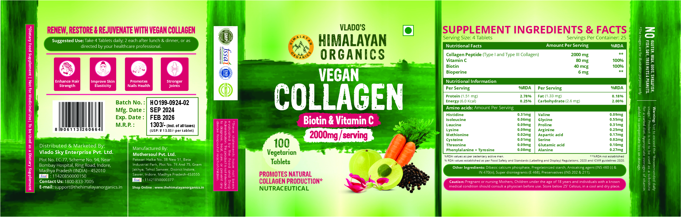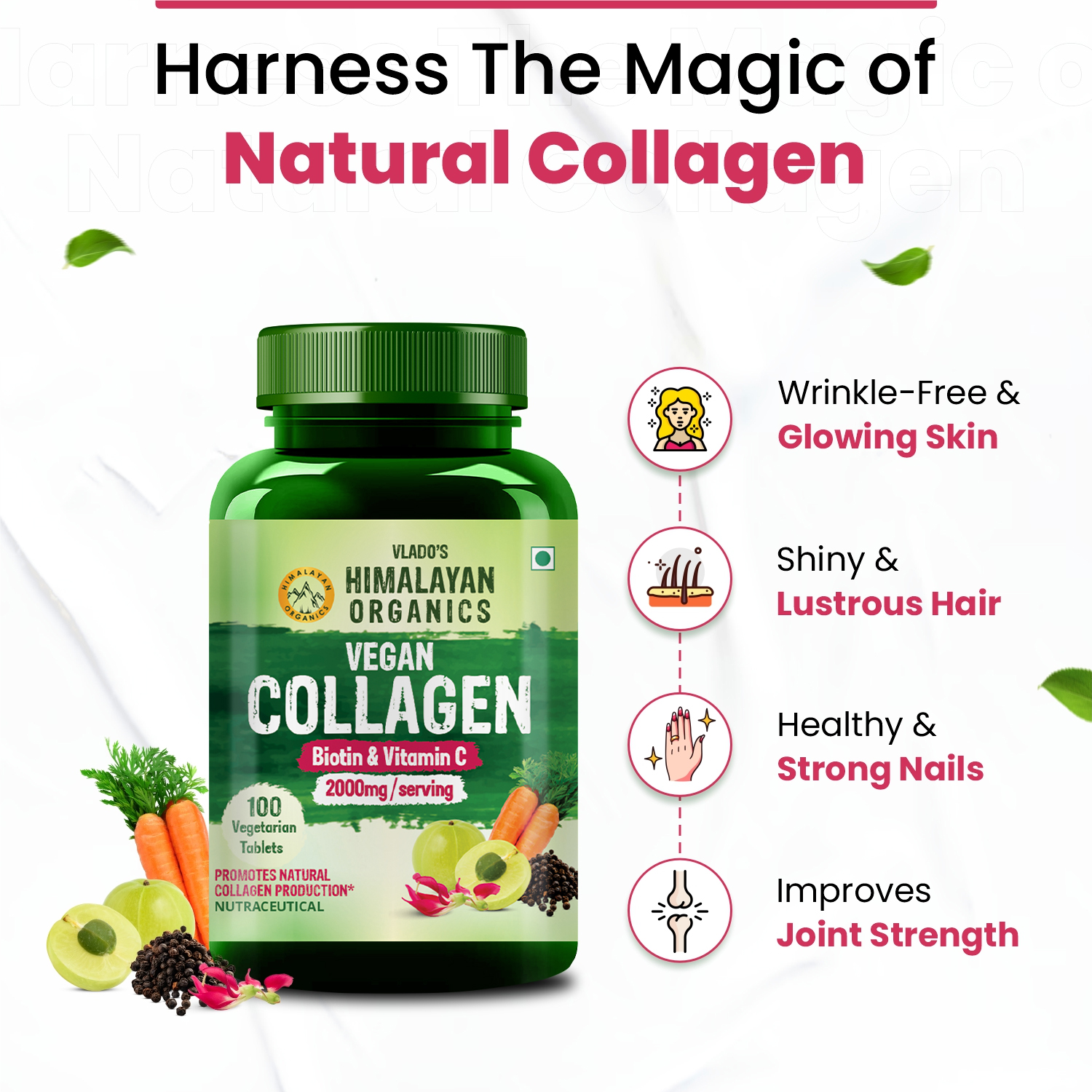 HEALTHY & SHINY HAIR: Biotin along with Vitamin C plays a very crucial role in faster hair growth. The blend ensures that you get hair strengthening from roots to tips, along with that it also nourishes your scalp bed, and hydrates hair roots. This superb plant-based blend ensures that your hair looks thicker, fuller, shiny, and lustrous.NAILS & JOINT STRENGTH: Biotin, a member of Vitamin B, is known to help strengthen soft and brittle nails and strengthen nail cuticles reducing breaking and splitting. Also, experience the benefits of strengthened joints and muscles with our vegan collagen, offering support for an active and fulfilling lifestyle.BOOST NATURAL COLLAGEN PRODUCTION: Himalayan Organics Vegan Collagen Tablet is a mindfully crafted, vegan-friendly way to build collagen. This collagen supplement utilizes the power of plants to support your body's natural ability to produce and maintain healthy levels of collagen. GLOW WITH VITAMIN C: This powerful antioxidant comes from amla extract and helps revitalize cells to support collagen production for a glowing radiance boost from the inside out.EASY TO SWALLOW, SAFE COLLAGEN TABLETS: At Himalayan Organics, every product is developed finely, keeping in mind the concept of holistic wellness. These tablets are no exception. Devoid of gluten, soy, dairy, fish, shellfish, tree nuts, artificial coloring, and harsh chemicals, these capsules are 100% vegan, sugar-free, and cruelty-free formulas for all.