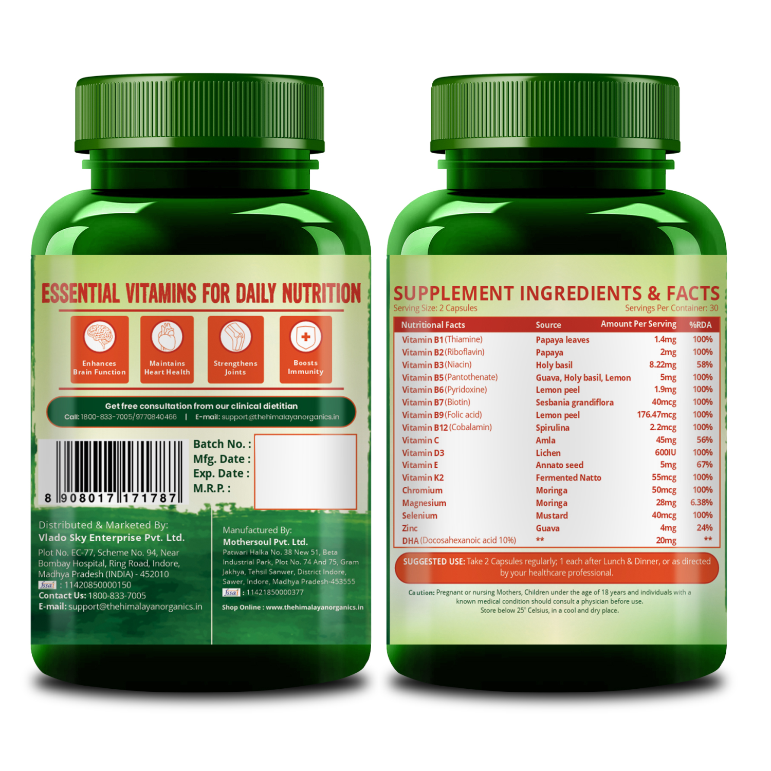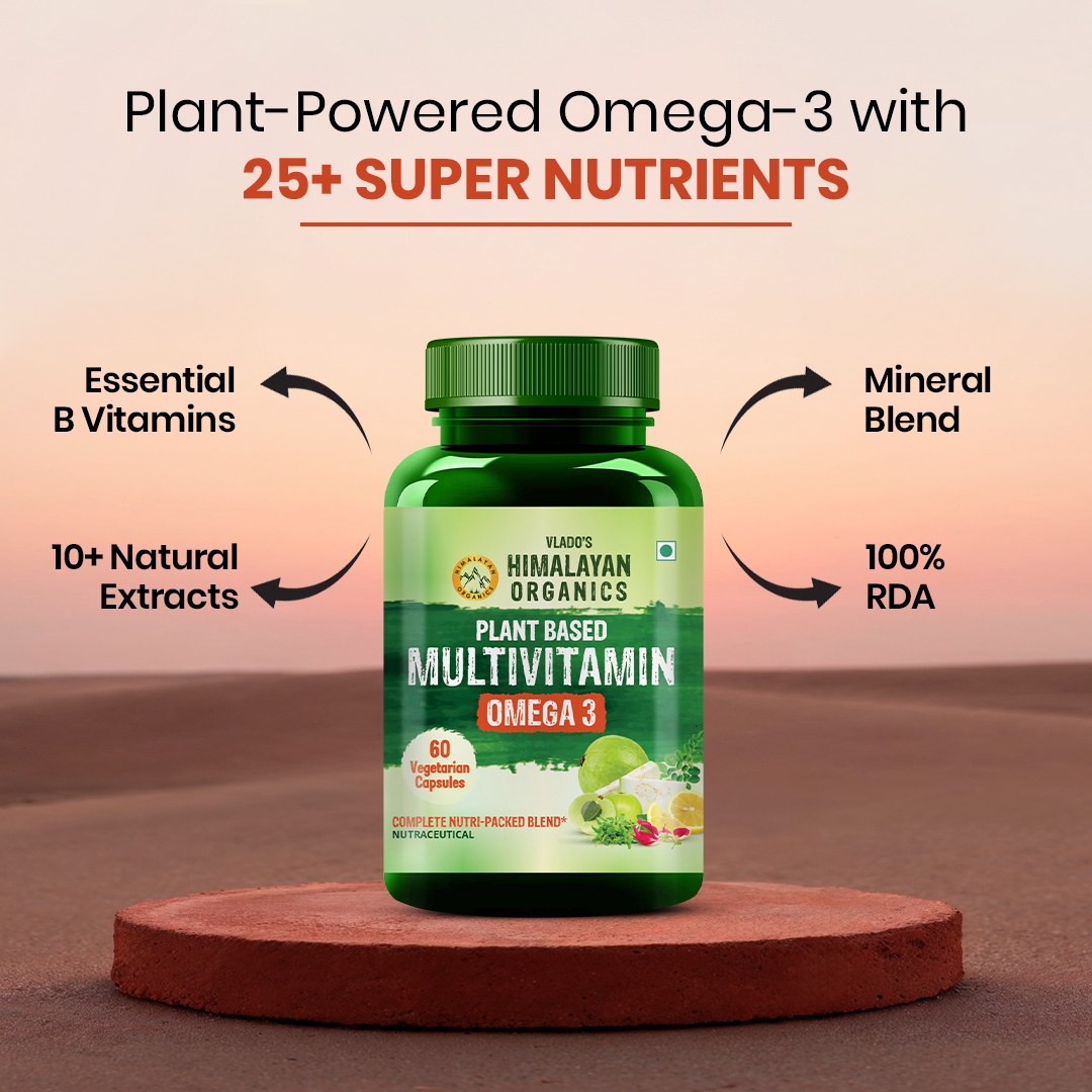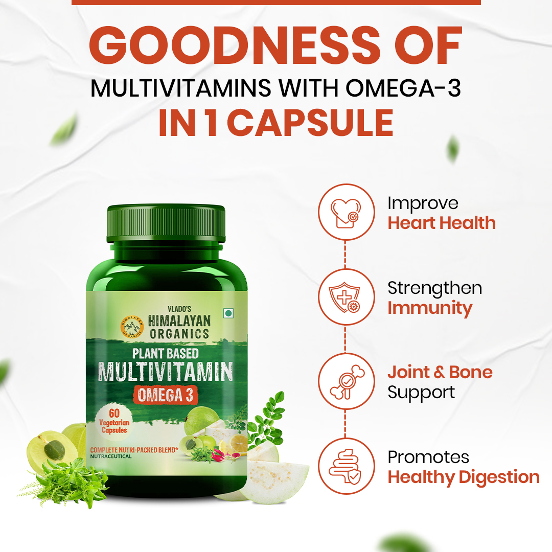 2 in 1: Himalayan Organics Multivitamins Omega 3 is a unique blend of both Omega-3 and Multivitamins in just one capsule. So need to take two separate pills when one can do the job! With 100% RDA of all the essential vitamins and minerals and Omega 3 sourced from deep sea algae, our Plant Based Multivitamins Omega-3 help boost immunity and improve heart health and brain function.DAILY NUTRITION: Himalayan Organics Plant-Based Multivitamin with Omega 3 helps you fill in the nutritional gaps left by a modern diet with a healthy dose of vitamins, minerals, and 13 nutritious plant extracts.