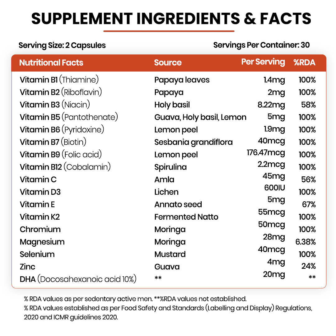 OMEGA 3 WITH DHA: Enriched with the goodness of algae, our Plant-Based Multivitamin with Omega 3 capsules sustains cognitive flexibility. The rich DHA content also offers joint health support, helps smooth out your state of mind, and supports sharper eye function.