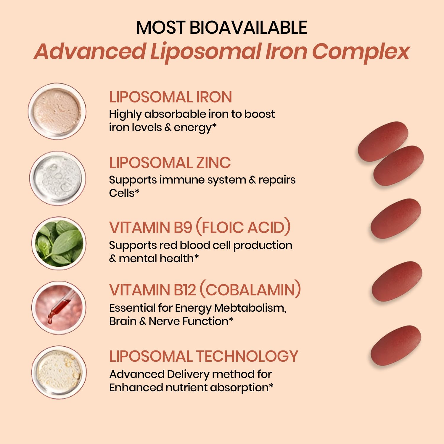 Ferrous Bisglycinate, Zinc Gluconate, Vitamin C, Vitamin B12, Folic Acid, Other Ingredients{Starch(1405), MCCP(460i), Dicalcium Phosphate(338), Talcum(553-iii), Sodium Starch Glycolate, Magnesium Stearate, Titanium Dioxide(171), Cross Carmellose, Sodium(466), HPMC E-15(464).