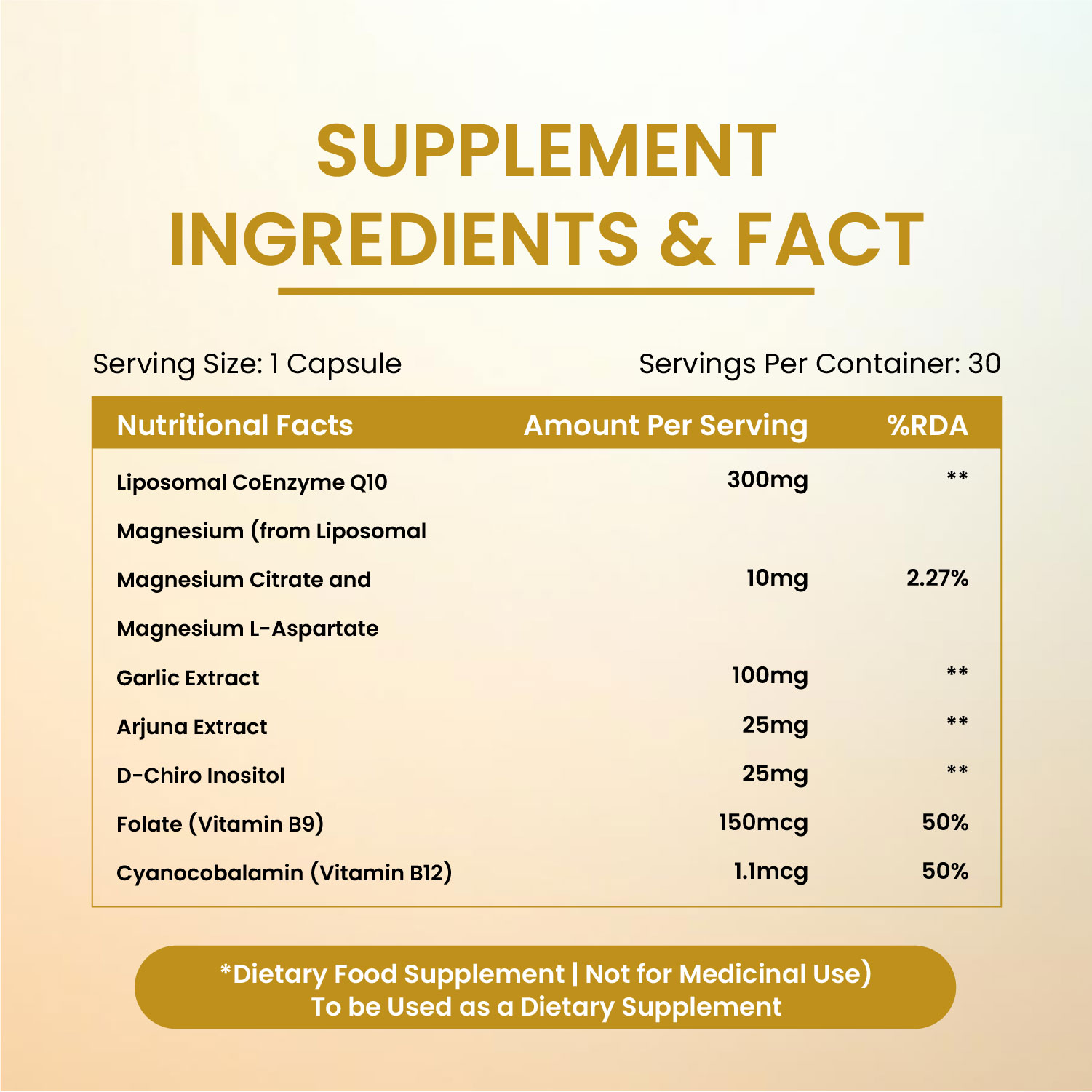 CoQ10 300mg+ with Magnesium, Vitamin B9 & B12, D-Chiro-Inositol, ,Garlic, Arjuna, Methyl, Folate