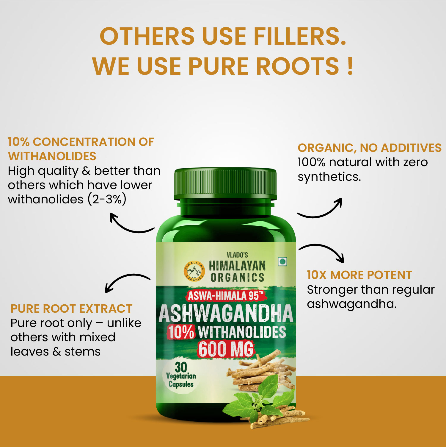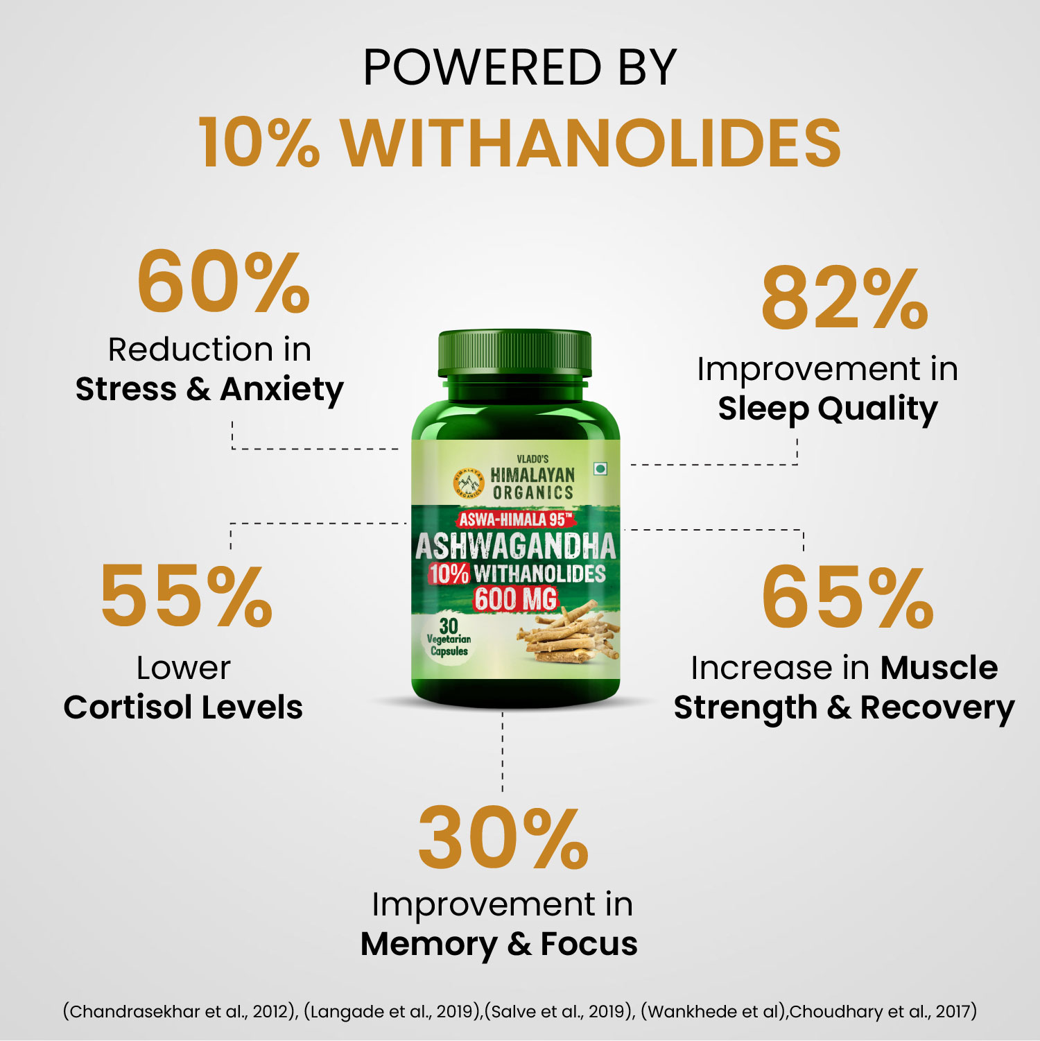 Vlados Himalayan Organics Ashwagandha Capsules are formulated with 10% Withanolides, the active bio-compounds that give Ashwagandha its strength. The higher concentration of Withanolides ensures superior potency compared to ordinary Ashwagandha. This standardized root-only extract supports stress relief, sharp focus, improved concentration, restful sleep, and enhanced physical strength, making it a powerful choice for daily balance and performance.