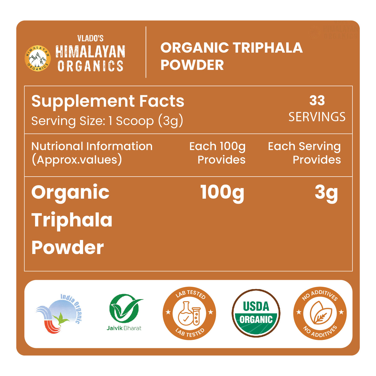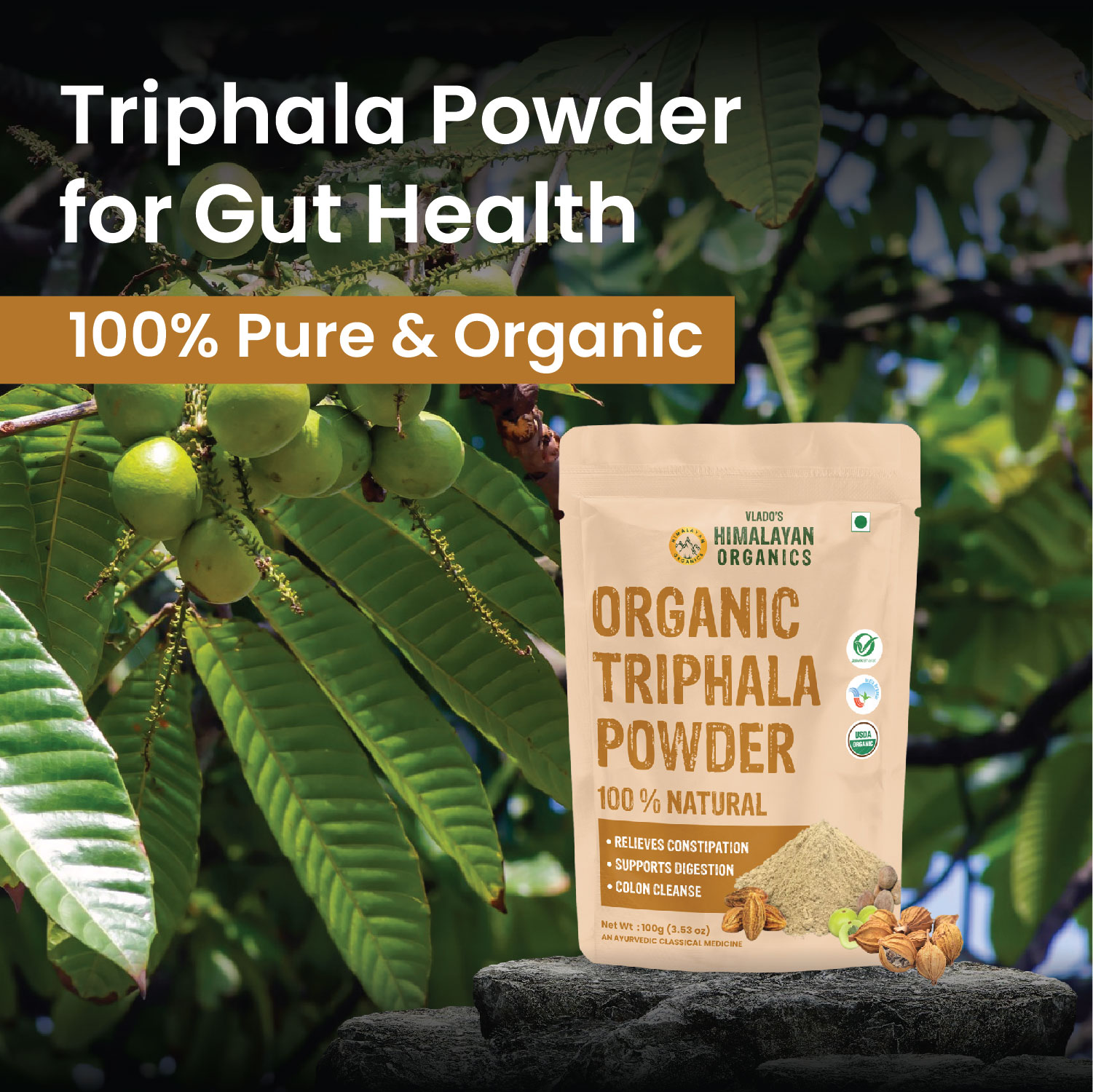 Vlado's Himalayan Organics Triphala Powder is a traditional Ayurvedic blend crafted from three powerful fruits -Amla, Haritaki, and Bibhitaki. Known for centuries as a natural remedy, this unique formula supports digestive health, helps in detoxification, and promotes overall wellness. Rich in antioxidants and anti-inflammatory compounds, Triphala helps maintain gut balance, improves digestion, and supports regular bowel movements. Made from 100% organic, carefully sourced ingredients, this powder is free from additives, preservatives, and artificial colors. Certified by India Organic, Jaivik Bharat, and USDA Organic, Vlado's Himalayan Organics Triphala Powder ensures purity and quality in every spoonful, making it a trusted choice for daily Ayurvedic care.