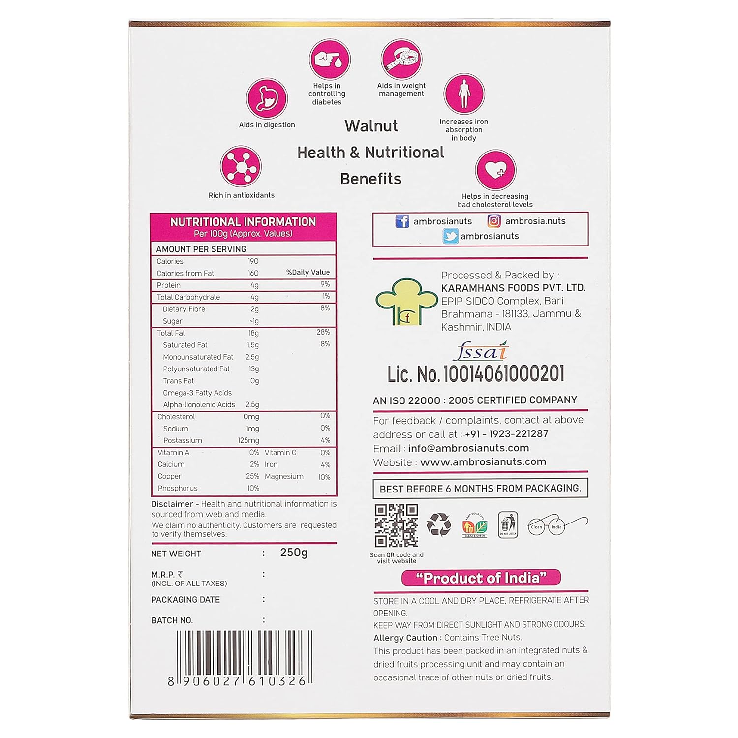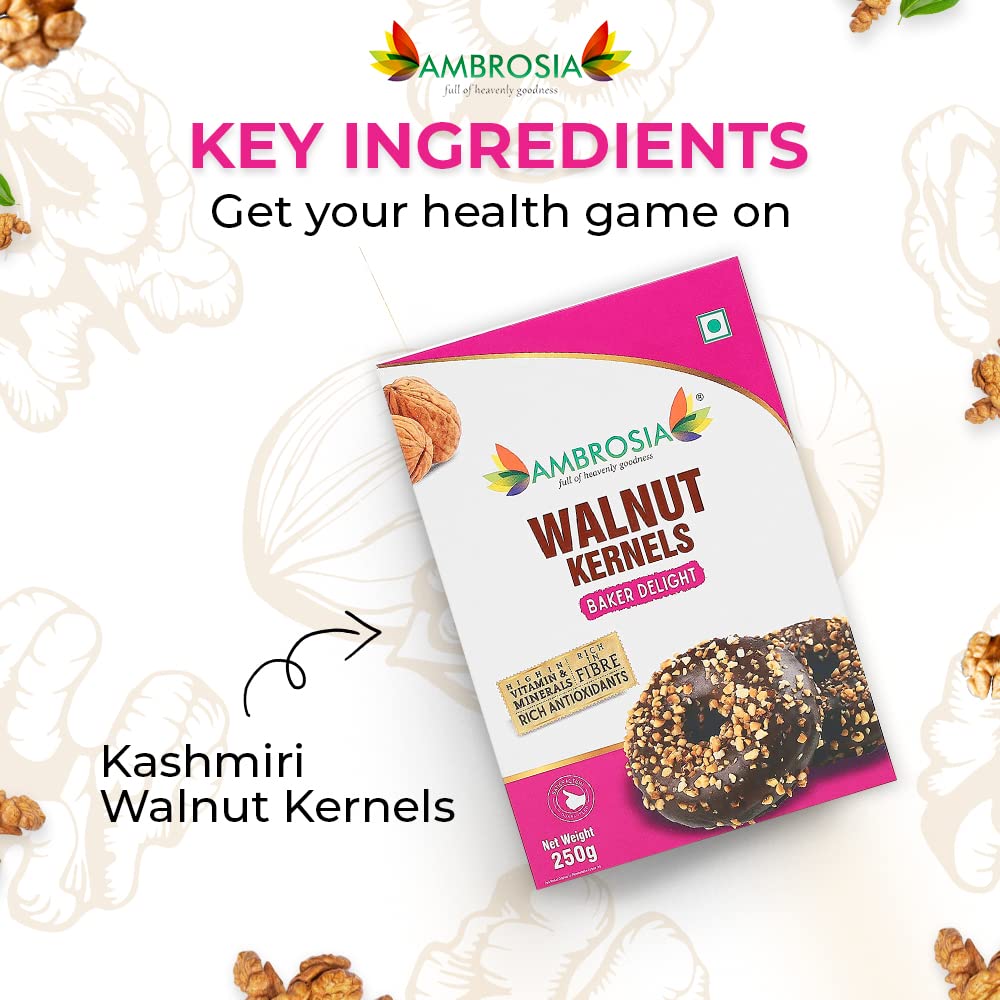 Ambrosia Walnuts Baker Delight 250g Light Broken 6-8 Pieces.Ambrosia double-sorts to offer Fresh, Raw & Crisp Walnut Kernels.Ambrosia Walnut Kernels are vacuum packed to retain freshness.Ambrosia Walnut Kernels are 100% natural No color-enhancing additives used.Ambrosia Light Amber halves are best used in brownies , cakes , laddus , salads etc..Size of the walnuts does not modify the nutrient value of the walnut kernels.Hygienically packed in a facility meeting food safety standard Usage : Soak overnight 12-14 Halves or a handful of walnuts in water to consume next day Benefits :.Walnuts are rich in Omega-3 fatty acids that have positive anti-inflammatory effect.Heart Health: Walnuts are shown to improve cardiovascular risk factors by lowering LDL (Bad) cholesterol.Walnuts are rich in plant-based proteins and good unsaturated fats : Zero Cholesterol & Zero Trans Fats.Walnuts are a Super Food for ALL age groups especially children - Aids in brain development & improves cognitive performance.Excellent for weight loss plans: Walnuts are high in dietary fibre which helps curb mid-day cravings.Sprinkle walnuts on salads, desserts and brownies to get your nutrients with an extra crunch "