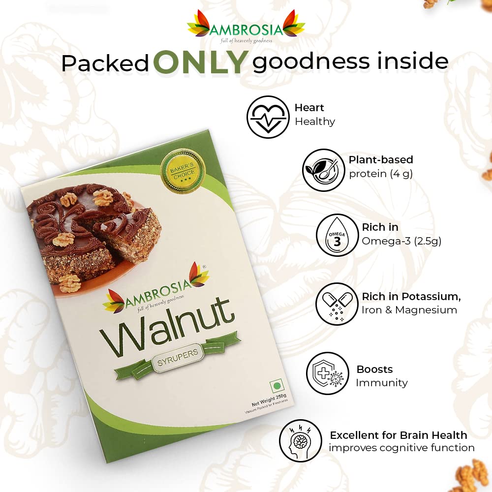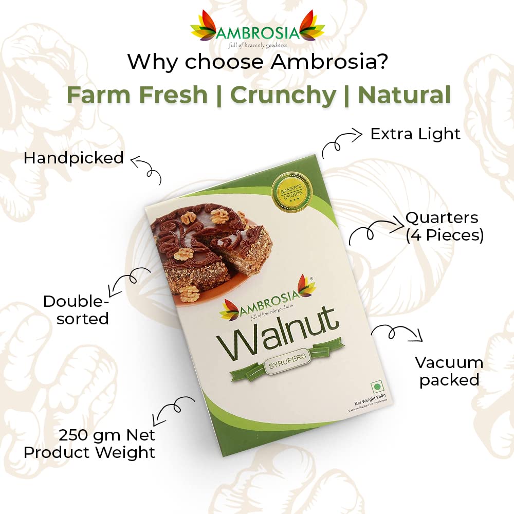 Ambrosia Walnut Kernels Syruper - Extra Light color Size - Quarters , Ambrosia double-sorts nuts to offer Fresh, Raw & Crunchy Walnut Kernels Handpicked from Valley of Kashmir - richer in taste Ambrosia Walnut Kernels are vacuum packed and cold-stored until dispatch to retain freshness and Ambrosia Walnut Kernels are 100% NATURAL No color-enhancing additives used Consistent Quality Assured throughout the year, Vacuum & hygienically packed in fssai approved processing facility; Syruper Walnut Kernels are best used as ingredient in brownies, cakes, kheer or for garnishing; sprinkle walnuts on salads, desserts and yogurts for that extra crunch