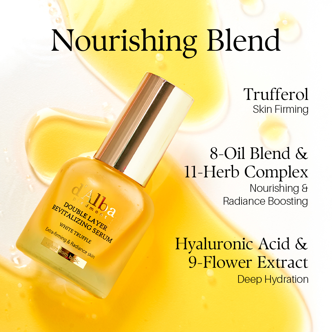 dAlba Piedmont Italian White Truffle Double Layer Revitalizing Serum is a dual-phase serum combining a hydrating serum and nourishing oil for deep moisture, improved elasticity, and a radiant glow. Enriched with Italian white truffle extract and vitamin E for antioxidant protection, it is lightweight yet and suitable for daily use, day or night.