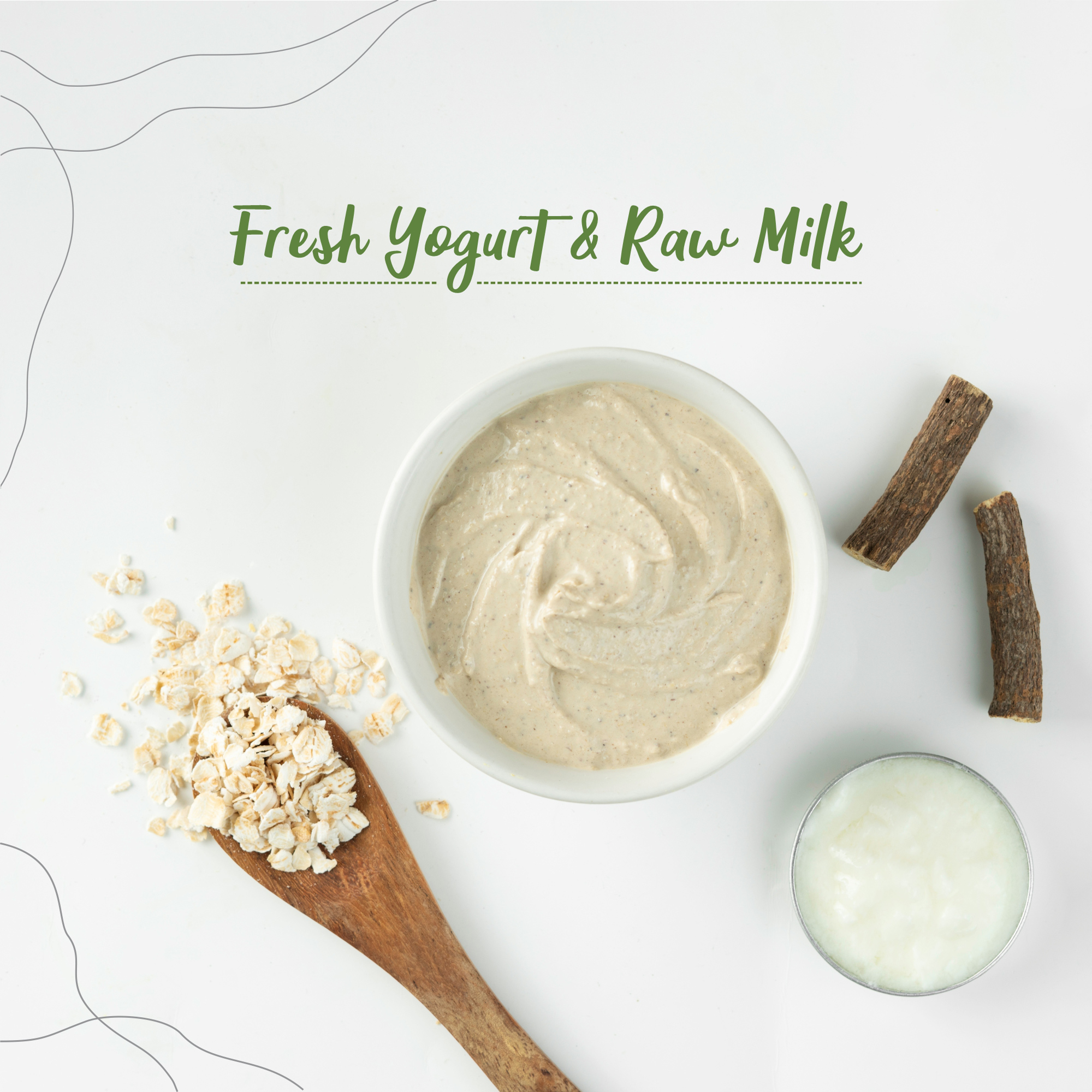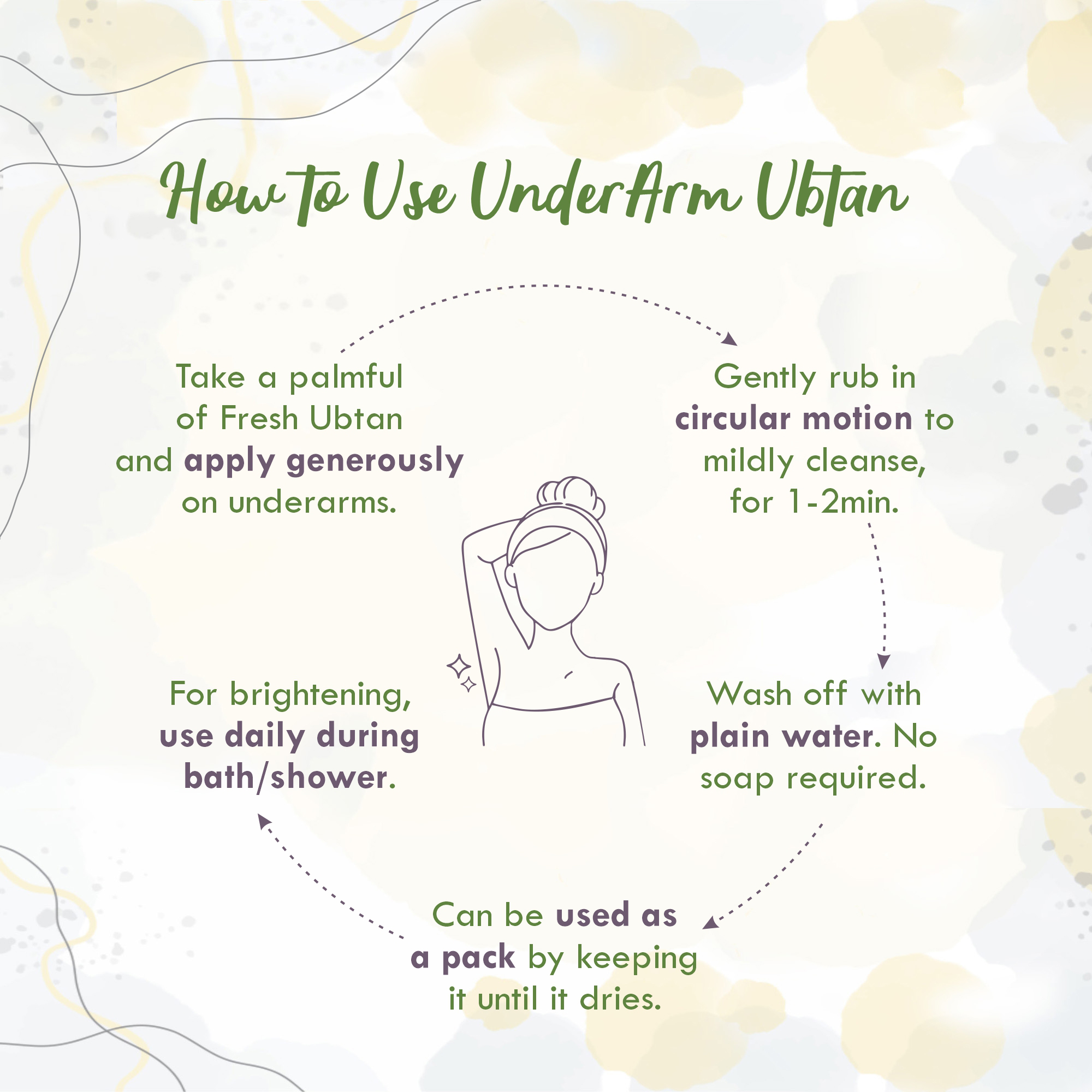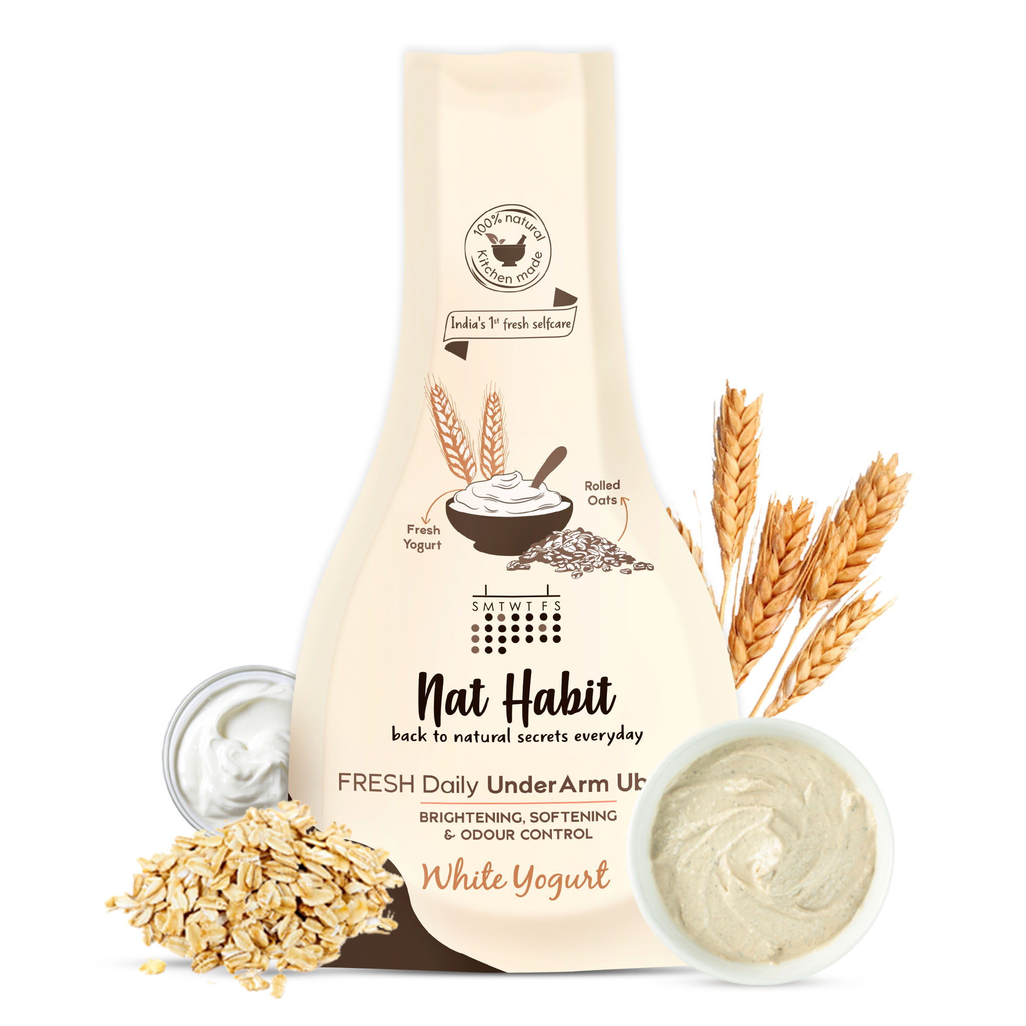Kitchen fresh natural 4-in-1 UnderArm care with the Daily UnderArm Ubtan. Made with active nutrients such as fresh yogurt, raw milk, rolled oats, ground mulethi & apple cider vinegar, the Ubtan is designed to meet all stubborn underarm needs with a single product.